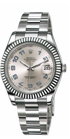Model: 116334-GRYAO - CASE = [Material:Stainless Steel], [Case Diameter:41], [Bezel:Fluted 18k White Gold], [Case Back:Solid], [Water Resistant:100 Meters - 330 Feet], [Crystal:Scratch Resistant Sapphire], DIAL = [Color:Silver Blue Arabic], MOVEMENT = [Type:Automatic Self Winding], [Crown:Screw Down], BAND = [Clasp:Oysterlock Clasp], [Type:Stainless Steel Oyster], (In Stock - Ready to ship.)