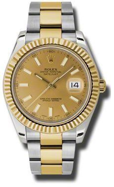 Model: 116333-CHSO - CASE = [Material:Stainless Steel], [Case Diameter:41], [Bezel:Fixed Fluted Yellow 18kt Gold], [Case Back:Solid], [Water Resistant:100 Meters - 330 Feet], [Crystal:Sapphire], DIAL = [Color:Champagne Stick], MOVEMENT = [Type:Automatic Self Winding], [Crown:Screw Down], BAND = [Clasp:Oysterlock Clasp], [Type:Stainless Steel with 18kt Yellow Gold center links], (Usually ships in 1 to 2 business days.)