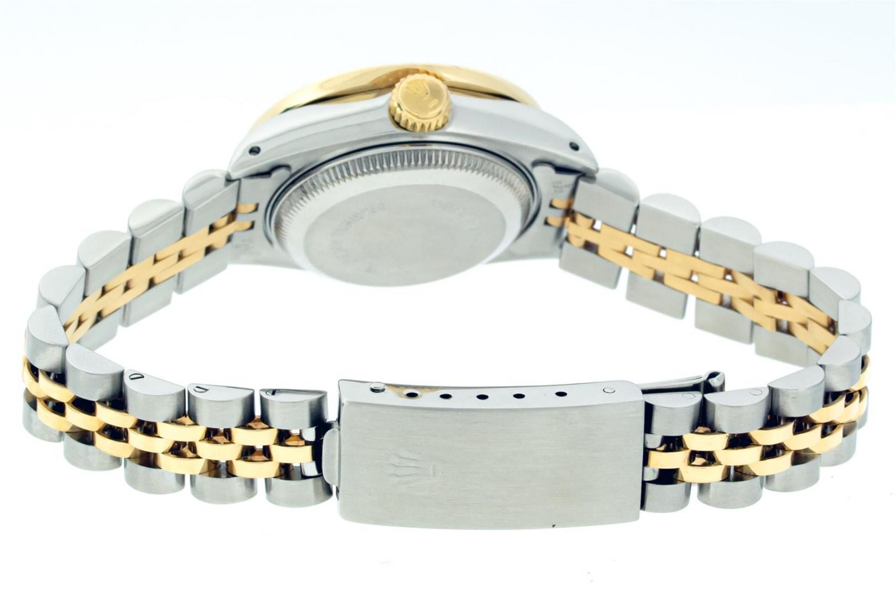 One Ladies Sapphire Quickset 18K Yellow Gold and Stainless Steel Two Tone Rolex Oyster Perpetual Datejust Polished Bright with Satin Finish, Serviced & Electronically Tested, Stainless Steel Case: 26mm, 18K Yellow Gold Crown, Custom Bezel: New 18K Yellow Gold Beadset Diamond Bezel, Total Weight 2.0 Carat, Clarity: SI-VS, Custom Crystal: New Scratch Resistant Sapphire Cyclops Lens. Hands: Genuine Rolex luminous hands. Movement: Automatic Quickset Winding Movement 2135. Custom Dial: Refinished Single Cut Champagne Diamond Dial, Diamond Count: 10 Diamonds In Dial, Clarity: VVS, Date Window: 3 O'Clock Position Date Display, Model: Quickset Datejust 69173, Condition: G-6 Extra Fine. Bracelet: Stainless Steel and Yellow Gold Jubilee Band. Bright Polish & Satin Finish. 6.25 Inch Length, Adjustable. Standard Clasp, With Rolex Logo. This Watch Has Been Serviced Time Tested And Is In Excellent Condition It Is Free Of All Scratches And Dents. This Rolex Complete Set Comes With The Following Accessories: Rolex Box, Rolex Booklets, Rolex Hang Tag, Rolex Wallet and Polishing Cloth.