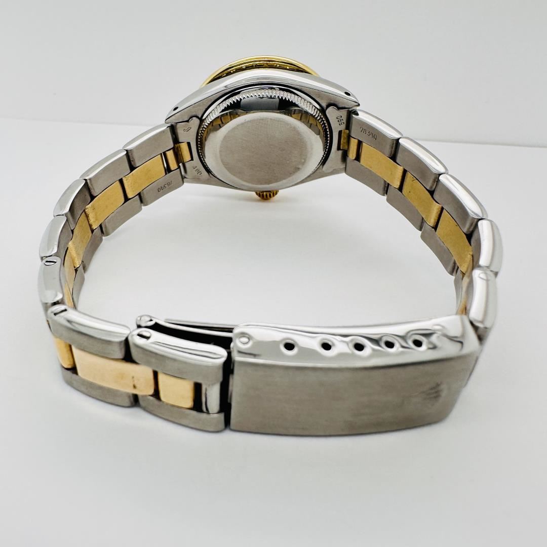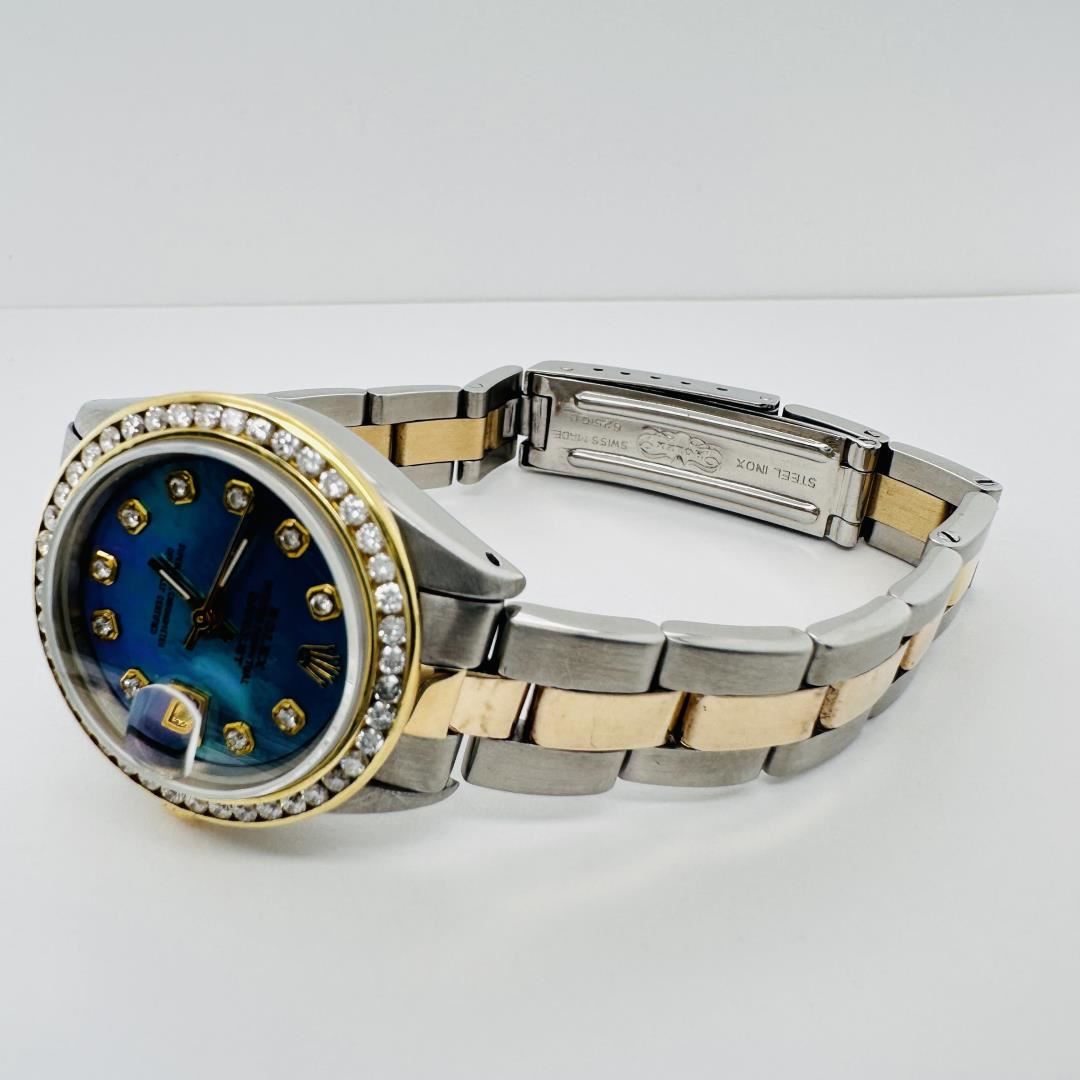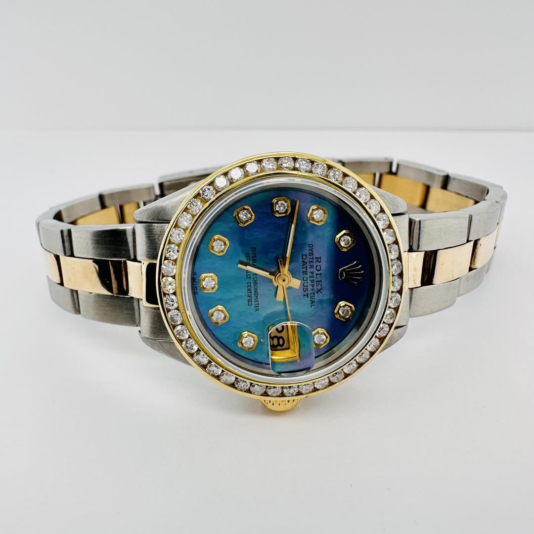 This Rolex Datejust Ladies (26mm) features a two-tone Oyster bracelet in stainless steel and 18k yellow gold. The iridescent mother-of-pearl dial is set with custom diamond hour markers, complemented by a custom yellow gold diamond bezel. A striking combination of elegance and luxury, this timepiece embodies Rolex craftsmanship with a unique, personalized touch.