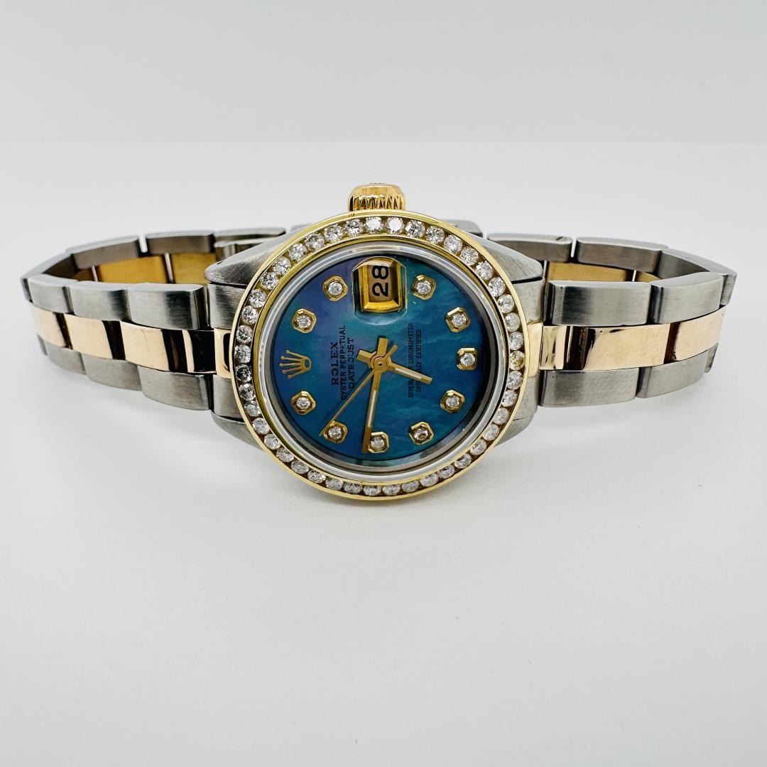 This Rolex Datejust Ladies (26mm) features a two-tone Oyster bracelet in stainless steel and 18k yellow gold. The iridescent mother-of-pearl dial is set with custom diamond hour markers, complemented by a custom yellow gold diamond bezel. A striking combination of elegance and luxury, this timepiece embodies Rolex craftsmanship with a unique, personalized touch.