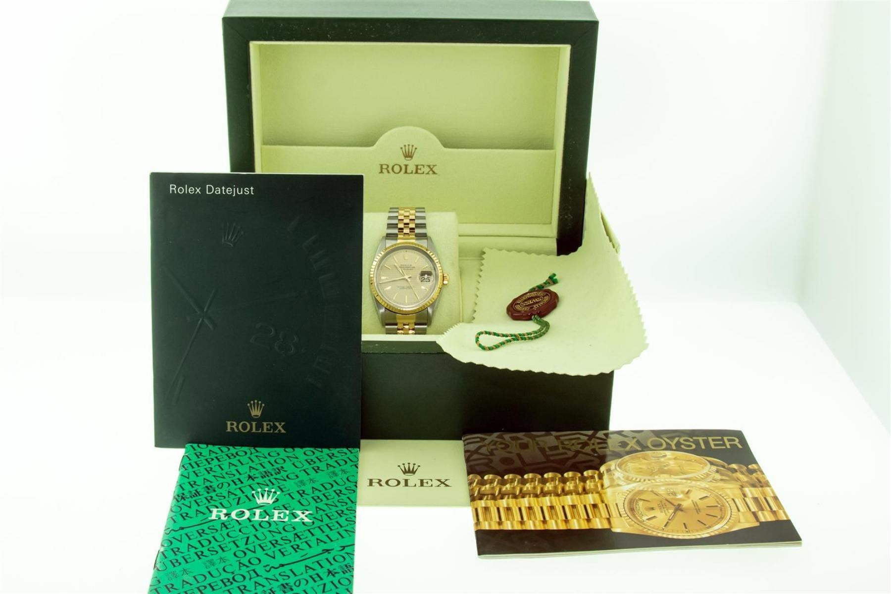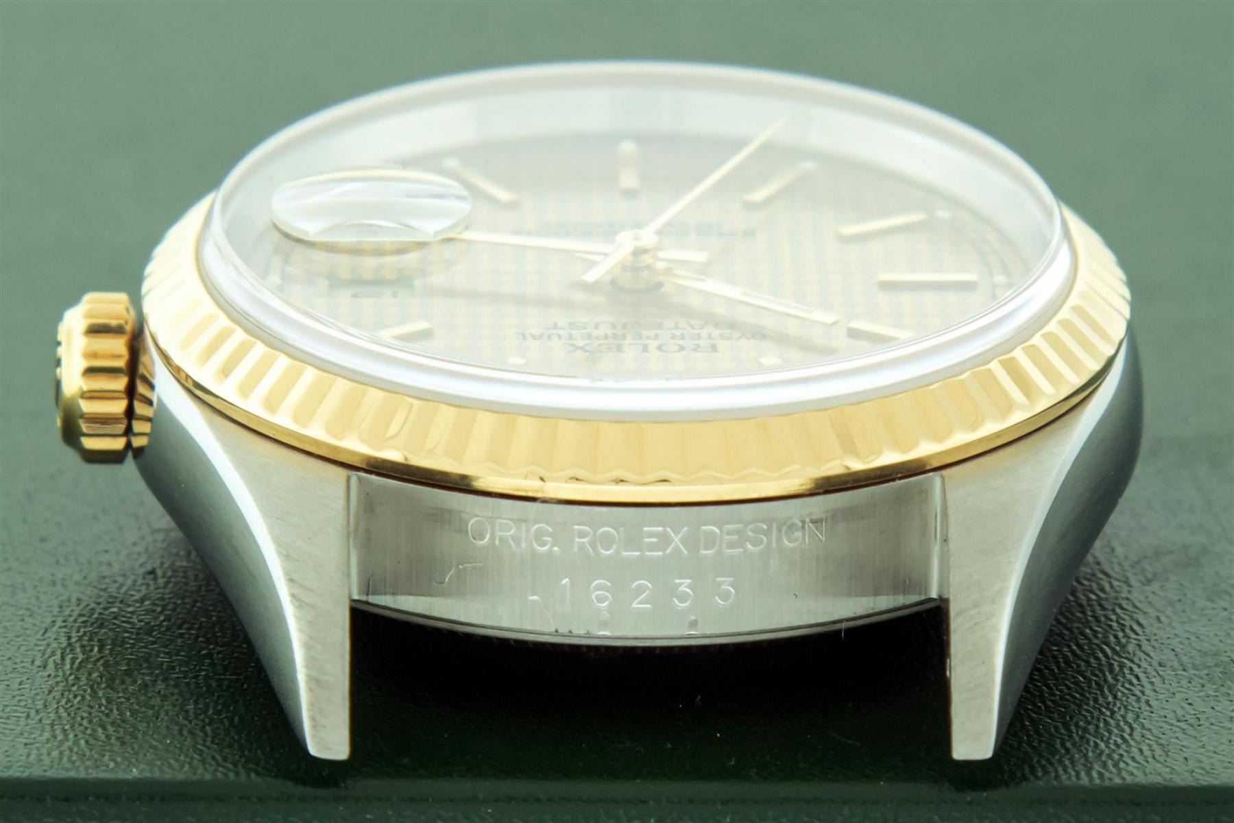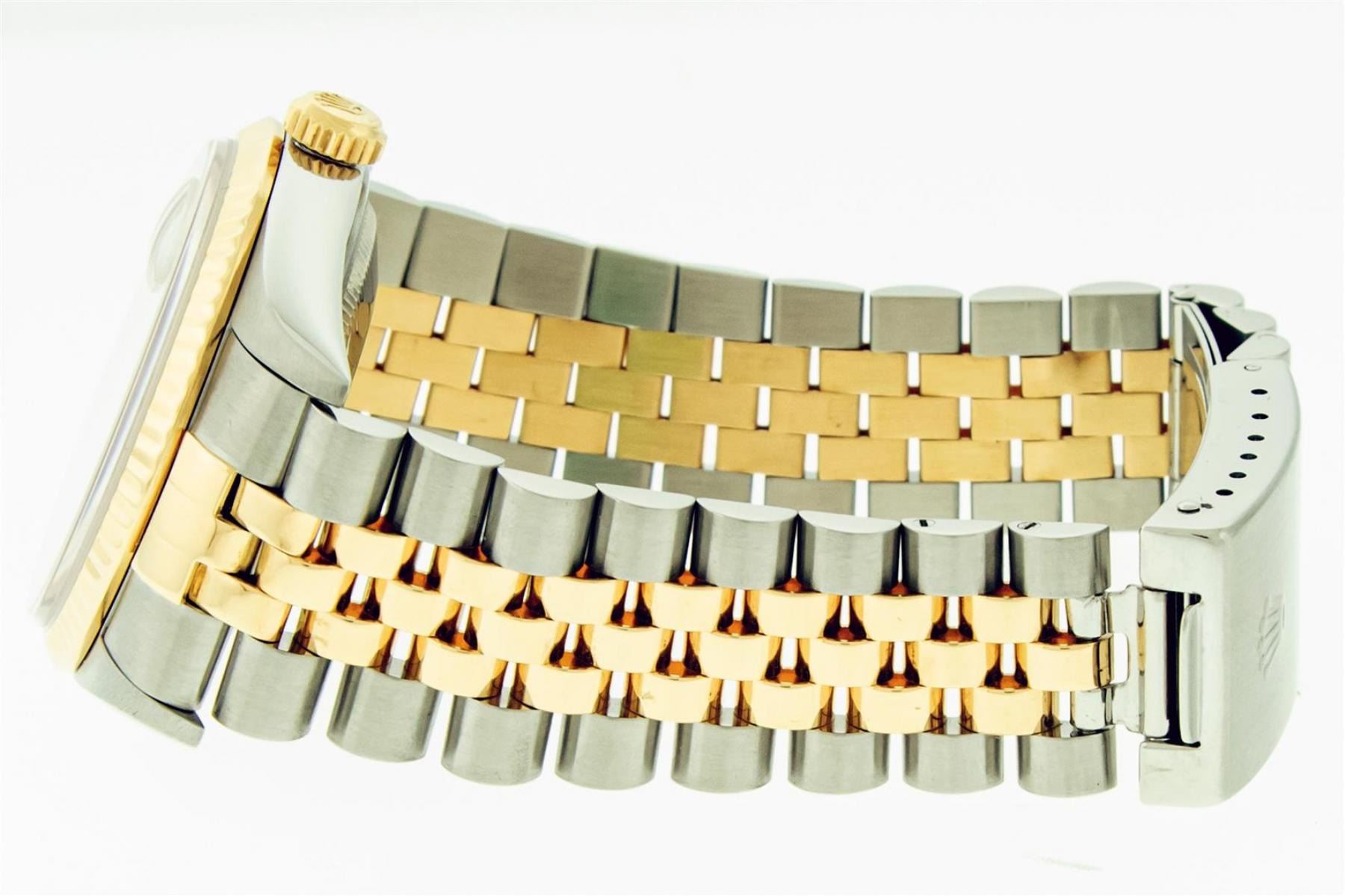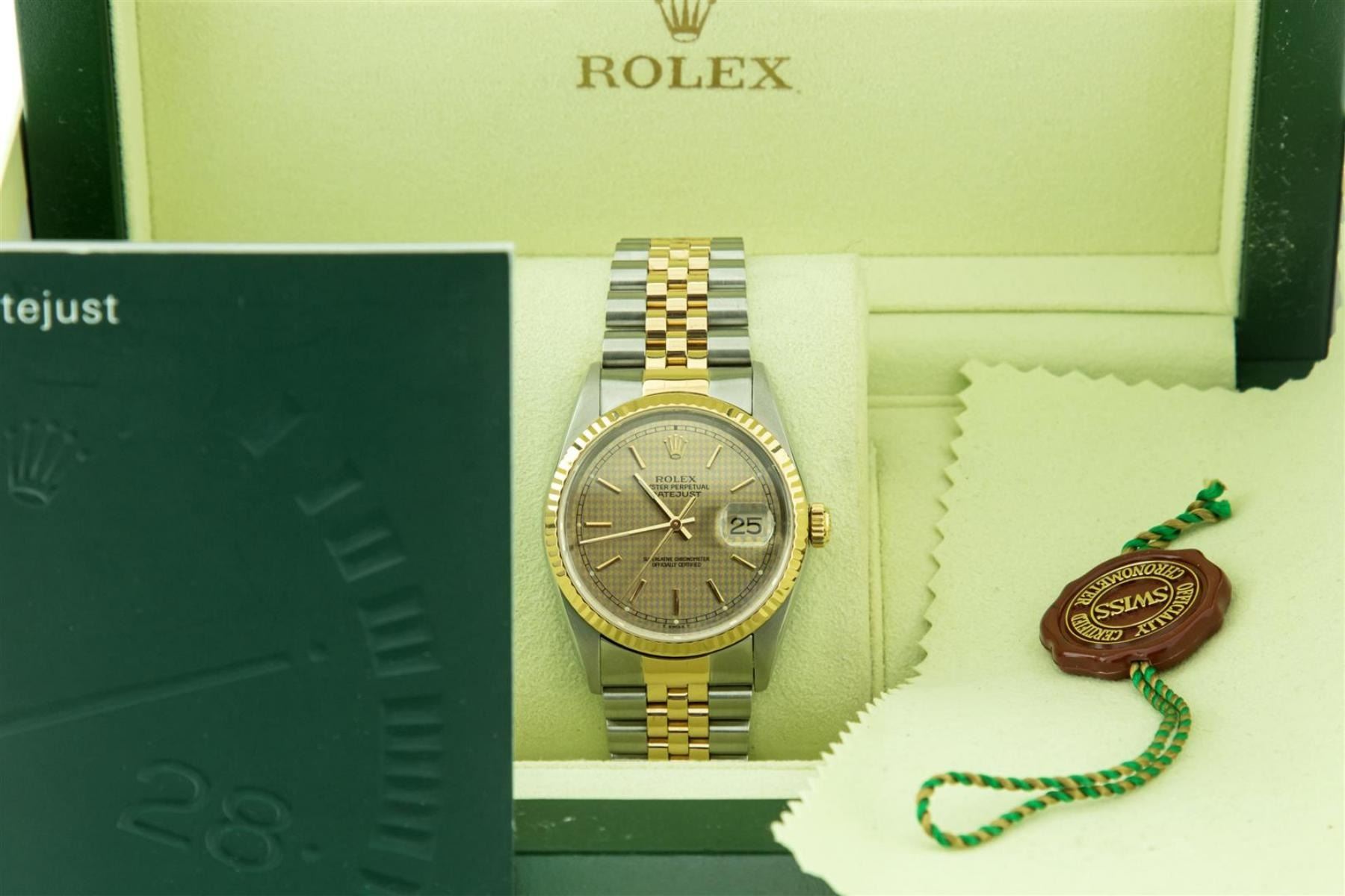 One Mens 18K Yellow Gold & Stainless Steel Two Tone Rolex Oyster Perpetual Datejust Polished, Serviced & Electronically Tested, 18K Yellow Gold & Stainless Steel Case: 36mm, Original 18K Yellow Gold Crown, Bezel: Original Rolex 18K Yellow Gold Fluted Bezel. Crystal: Scratch Resistant Sappphire Crystal Lens. Hands: Genuine Rolex Luminecent Hands. Movement: Automatic Winding Movement 3135. Dial: Rare Original Rolex Factory Houndstooth Dial with Index Hour Markers, Date Window: 3 O'Clock Position Date Display, Quickset, Model: Sapphire Datejust 16233, Condition: G-6 Extra Fine. Bracelet: Tight Two Tone 18K Yellow Gold & Stainless Steel Jubilee Band Showing Little To No Stretch. Bright Polish. 7.0 Inch Length, Adjustable. Standard Clasp, With Rolex Logo. This Watch Has Been Serviced And Polished It Is Free Of All Scratches And Dents. This Watch Comes With The Following Accessories: Rolex Box, Rolex Booklets, Rolex Hang Tag.
