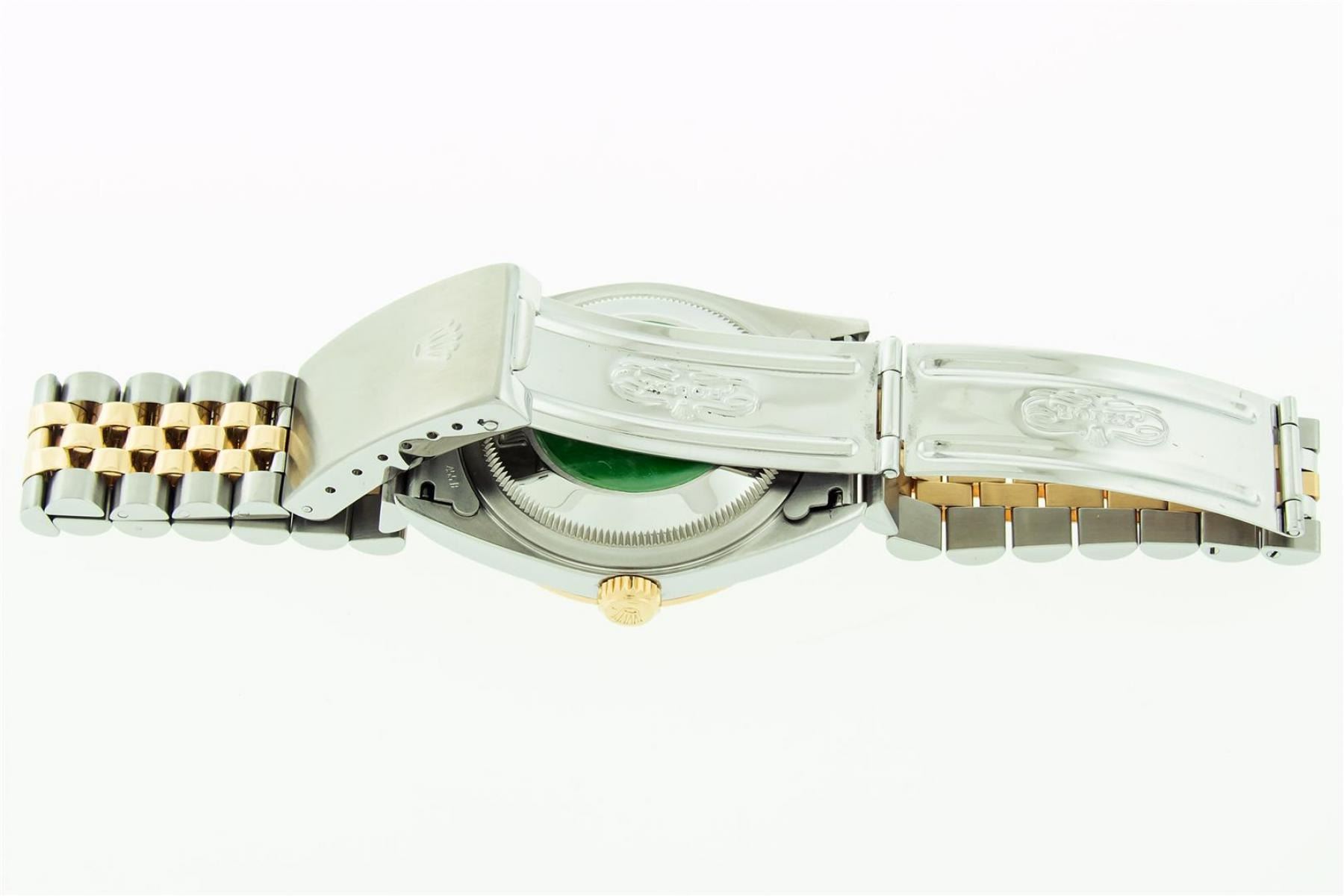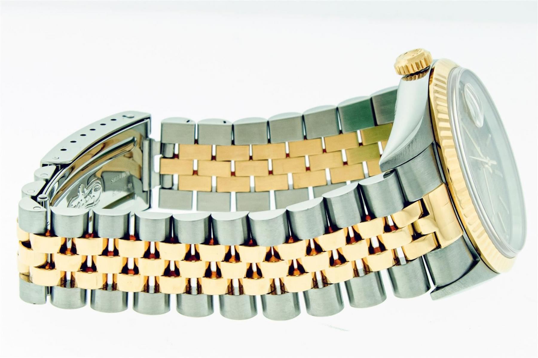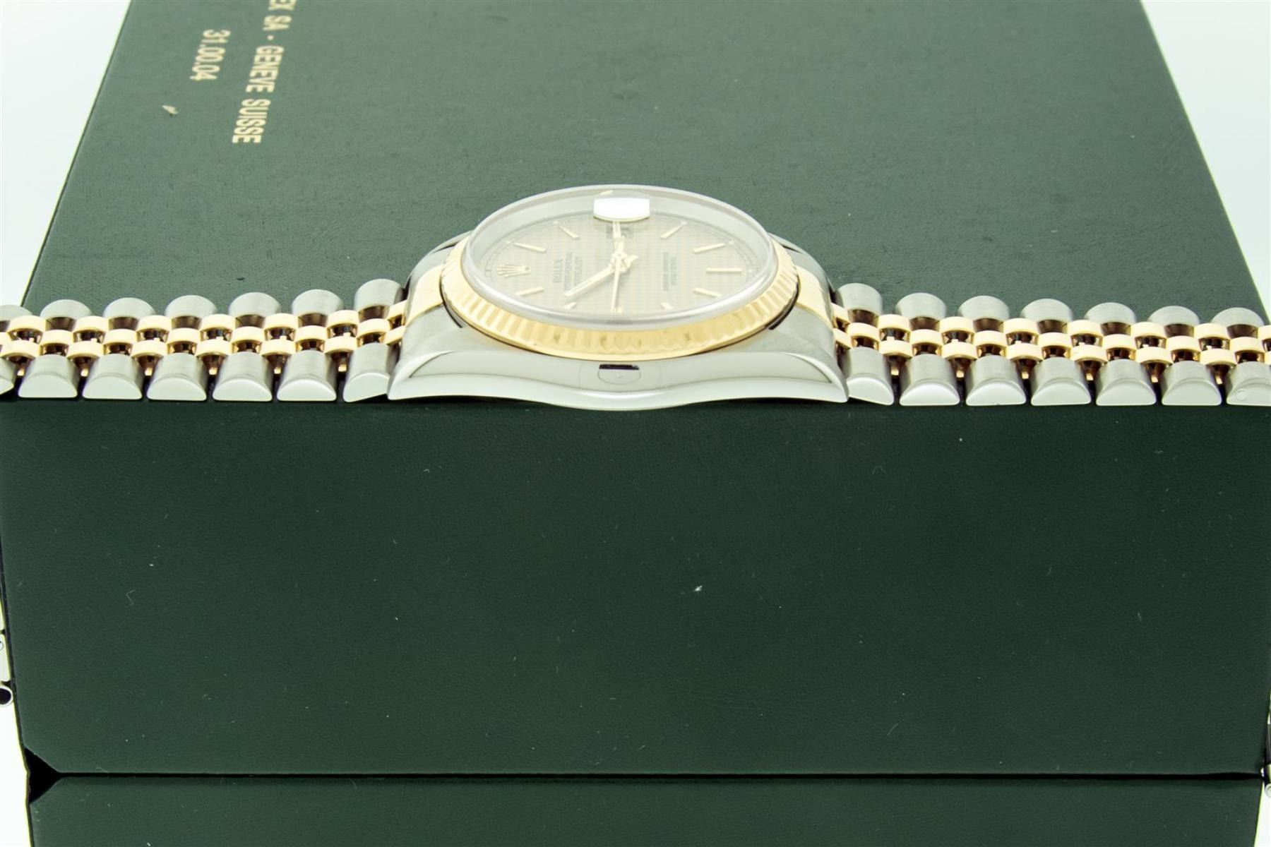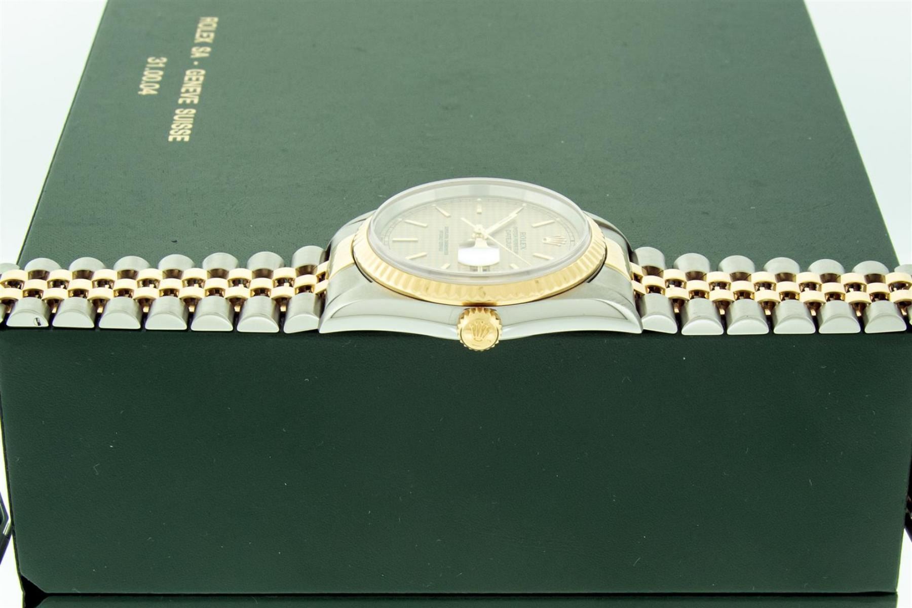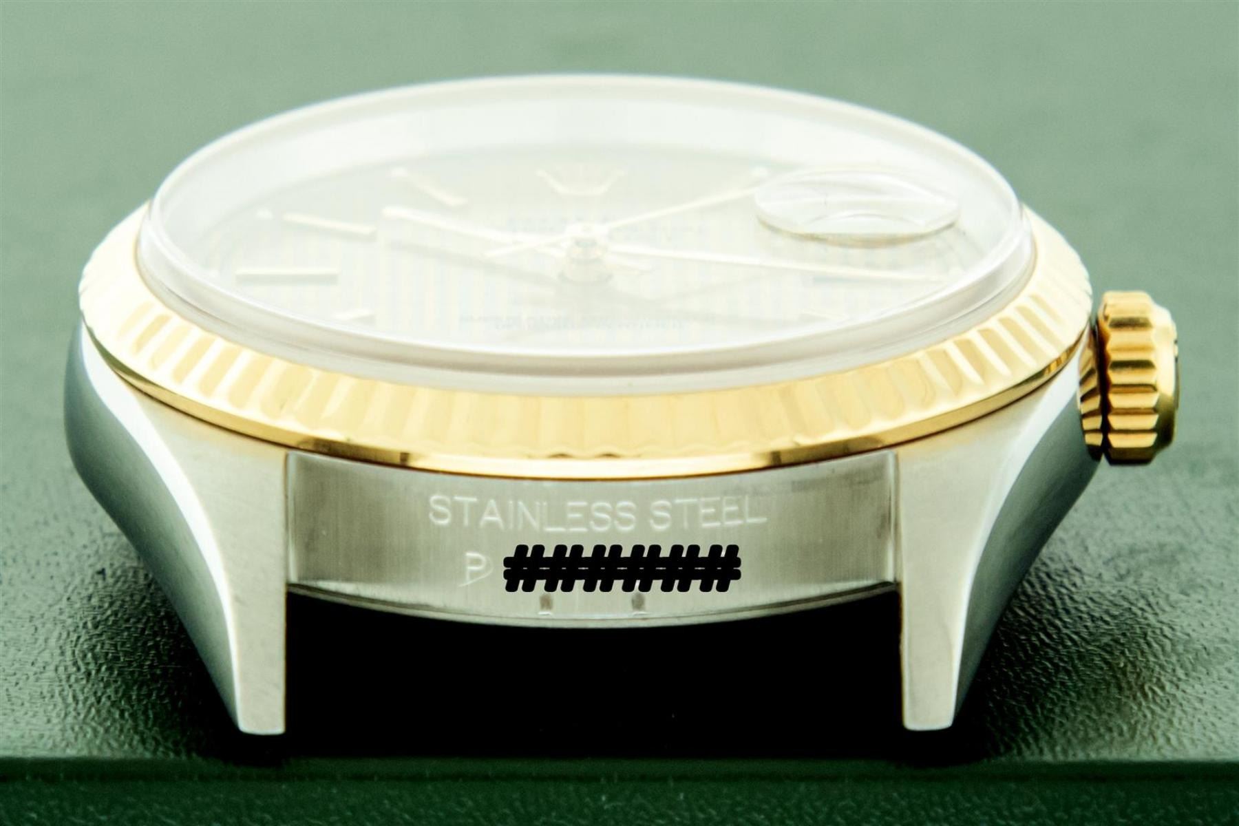 One Mens 18K Yellow Gold & Stainless Steel Two Tone Rolex Oyster Perpetual Datejust Polished, Serviced & Electronically Tested, 18K Yellow Gold & Stainless Steel Case: 36mm, Original 18K Yellow Gold Crown, Bezel: Original Rolex 18K Yellow Gold Fluted Bezel. Crystal: Scratch Resistant Sappphire Crystal Lens. Hands: Genuine Rolex Luminecent Hands. Movement: Automatic Winding Movement 3135. Dial: Rare Original Rolex Factory Houndstooth Dial with Index Hour Markers, Date Window: 3 O'Clock Position Date Display, Quickset, Model: Sapphire Datejust 16233, Condition: G-6 Extra Fine. Bracelet: Tight Two Tone 18K Yellow Gold & Stainless Steel Jubilee Band Showing Little To No Stretch. Bright Polish. 7.0 Inch Length, Adjustable. Standard Clasp, With Rolex Logo. This Watch Has Been Serviced And Polished It Is Free Of All Scratches And Dents. This Watch Comes With The Following Accessories: Rolex Box, Rolex Booklets, Rolex Hang Tag.
