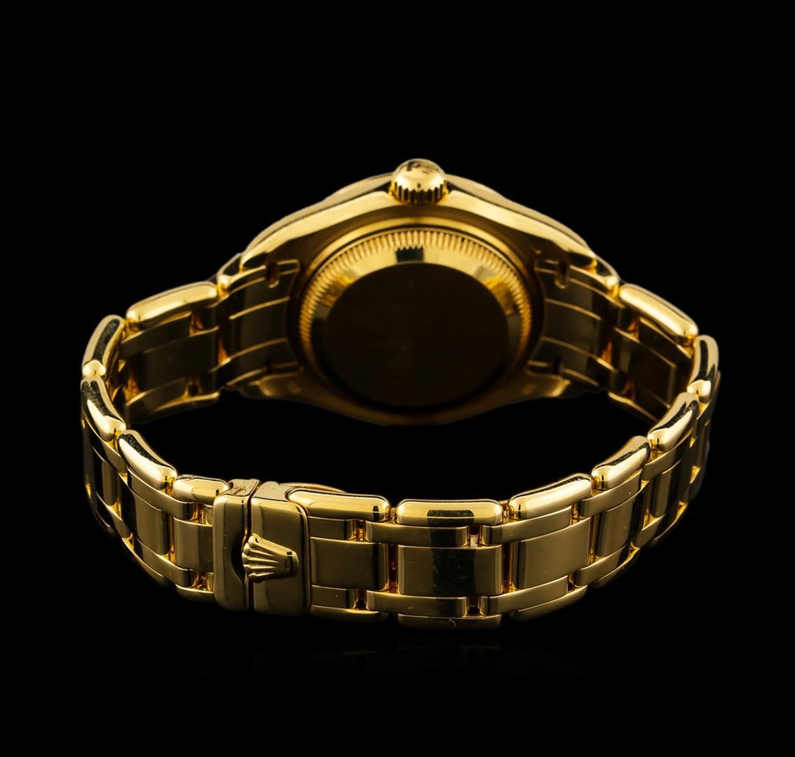 One Rolex Datejust Pearlmaster lady's watch featuring: Case: 29mm 18KT yellow gold. Case Shape: Round. Bezel: 18KT yellow gold set with diamonds. Movement: Automatic. Crystal: Sapphire. Dial: Gold with diamond markers and baton-type hands. Bracelet: 18KT yellow gold Rolex band. Condition: light wear on bracelet and small scratch on crystal near 12 o'clock, but otherwise in great condition.