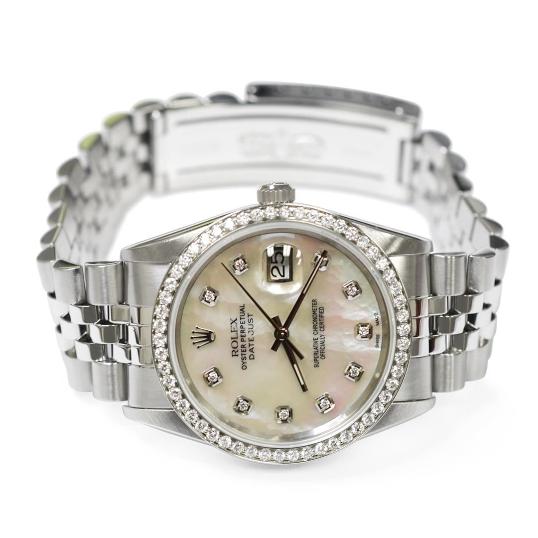 Rolex Unisex Datejust Stainless Steel 36mm Mother of Pearl Diamond Dial Watch Polished & Electronically Tested. Model: Datejust. Case: Stainless Steel. Bezel: Custom made diamond bezel with round brilliant diamonds all set in prong setting. Total Diamond Weight: 0.90ctw. Clarity: VS-SI Color: G-H. Crystal: Sapphire Crystal. Bracelet: Stainless Steel, Adjustable Standard Clasp with Rolex Logo. Dial: Mother of Pearl Diamond Dial. Date Window: 3 O'clock Position. Movement: Automatic Winding Movement. Water Resistant: Yes. Case Size: 36mm. Condition: Pre Owned, Watch is free of all Scratches and Dents, Extra Fine G-6.