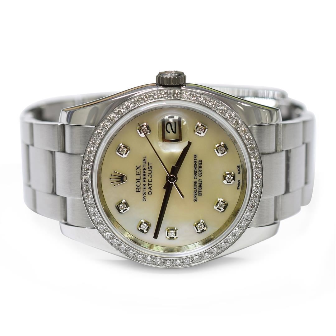 Rolex Unisex Datejust Stainless Steel 36mm Mother of Pearl Diamond Dial Watch Polished & Electronically Tested. Model: Datejust. Case: Stainless Steel. Bezel: Custom made diamond bezel with round brilliant diamonds all set in prong setting. Total Diamond Weight: 0.90ctw. Clarity: VS-SI Color: G-H. Crystal: Sapphire Crystal. Bracelet: Stainless Steel, Adjustable Standard Clasp with Rolex Logo. Dial: Mother of Pearl Diamond Dial. Date Window: 3 O'clock Position. Movement: Automatic Winding Movement. Water Resistant: Yes. Case Size: 36mm. Condition: Pre Owned, Watch is free of all Scratches and Dents, Extra Fine G-6.