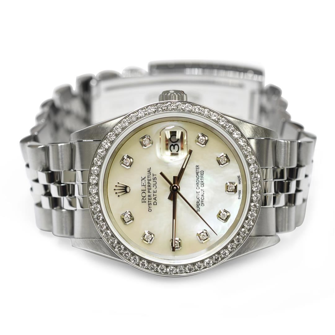 Rolex Unisex Datejust Stainless Steel 36mm Mother of Pearl Diamond Dial Watch Polished & Electronically Tested. Model: Datejust. Case: Stainless Steel. Bezel: Custom made diamond bezel with round brilliant diamonds all set in prong setting. Total Diamond Weight: 0.90ctw. Clarity: VS-SI Color: G-H. Crystal: Sapphire Crystal. Bracelet: Stainless Steel, Adjustable Standard Clasp with Rolex Logo. Dial: Mother of Pearl Diamond Dial. Date Window: 3 O'clock Position. Movement: Automatic Winding Movement. Water Resistant: Yes. Case Size: 36mm. Condition: Pre Owned, Watch is free of all Scratches and Dents, Extra Fine G-6.