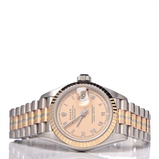 Tridor 69179 watch is crafted of 18 karat yellow, rose, and white gold and features a gold dial with silver Roman numeral hour markers, sapphire crystal, gold fluted bezel, 18 karat white gold case, Tridor multi-tone president bracelet, and an automatic movement.