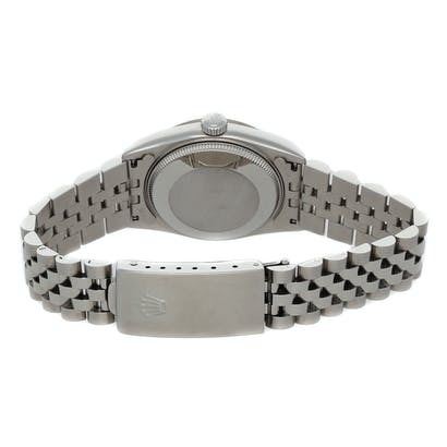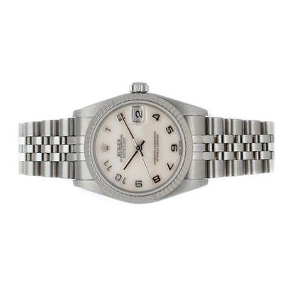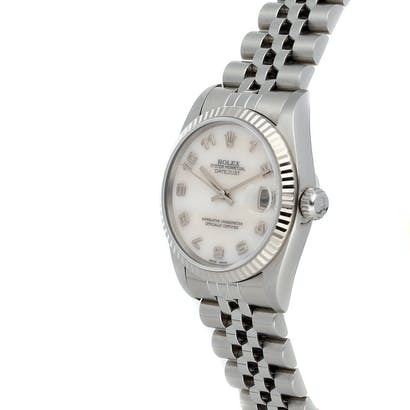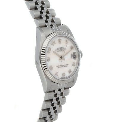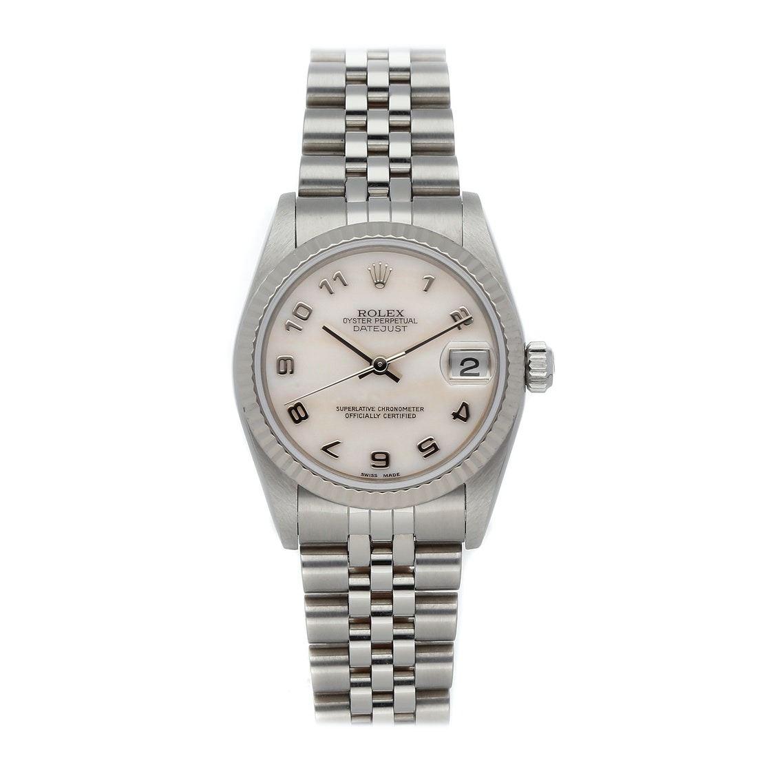 Pre-Owned Rolex Datejust (78274) self-winding automatic watch, features a 31mm stainless steel case with an 18k white gold fluted bezel surrounding a pink mother-of-pearl dial on a stainless steel Jubilee bracelet with folding buckle.