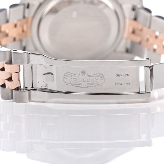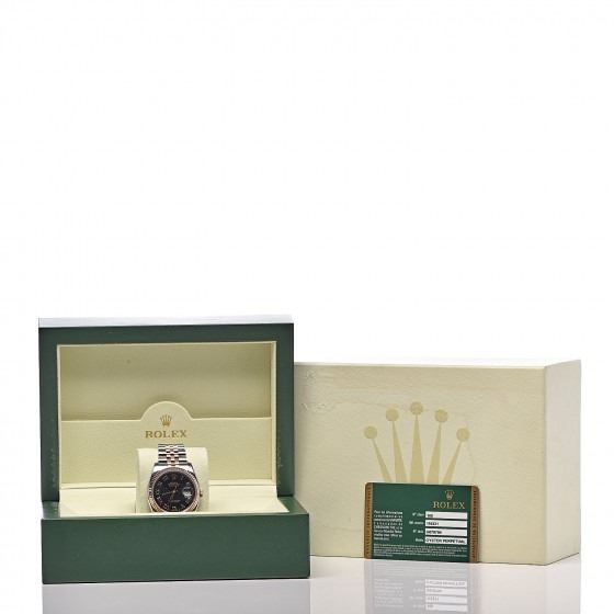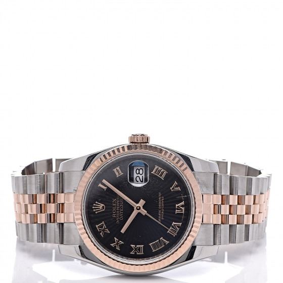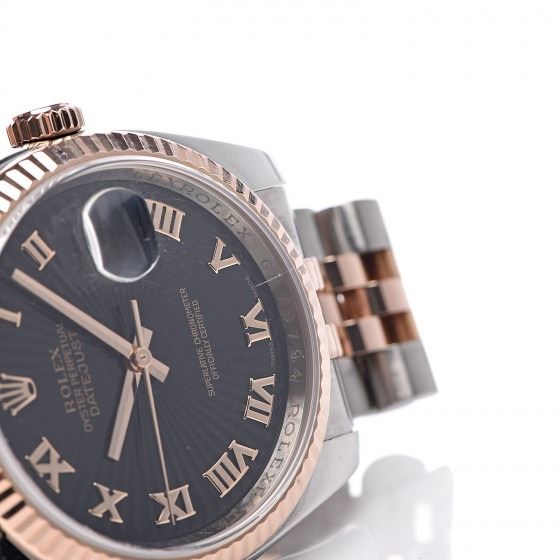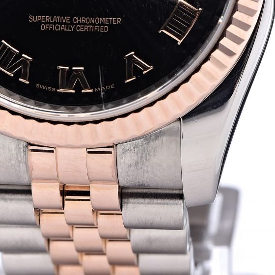 Watch is crafted of stainless steel and an 18 karat rose gold fluted bezel and crown. Features include a black guilloché accented dial with rose gold Roman numeral hour markers, a magnified date display, a two tone jubilee style bracelet, and automatic movement.