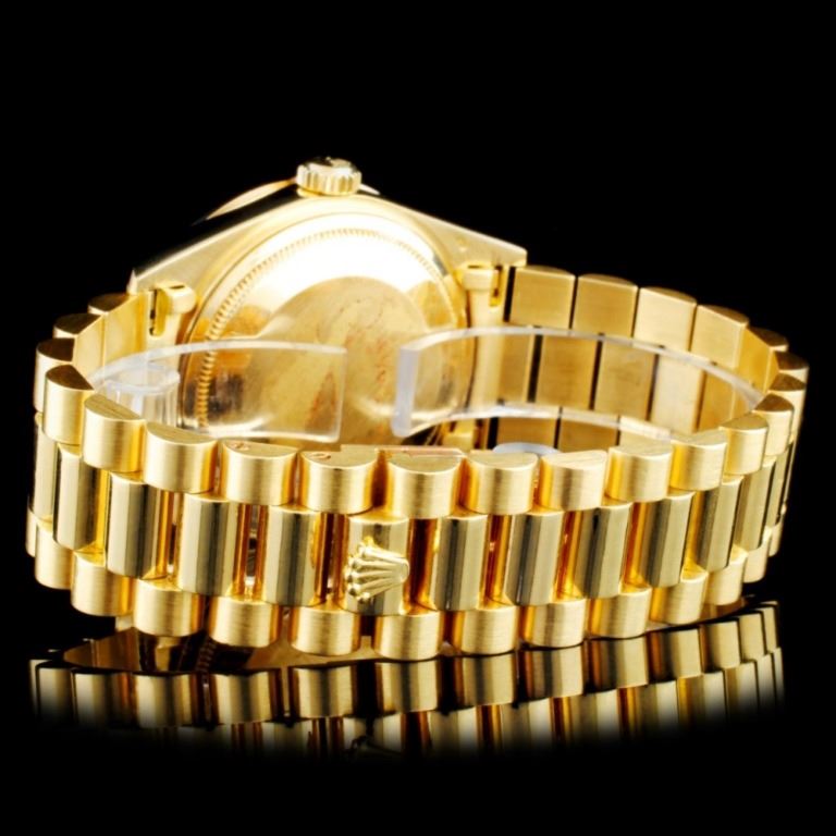 Estimated Retail Replacement Value: $32,995.00Ref: BAS44000Item no.: ARXV-0011Specification:Documents: Appraisal ReportModel: Oyster Perpetual Day-DateMovement: Perpetual, Self Winding ChronometerCase Material: 18K Yellow GoldCase Size: 36mmBracelet Materials: 18K Yellow GoldBracelet Style: 18K Yellow Gold Presidential BraceletBezel Material: Yellow GoldBezel Style: *Custom Pave-Set Diamond BezelFunction: Instantaneous Day-Date with Rapid SettingCrystal: Scratch-resistant Synthetic sapphire, Cyclops lens (2.5x) over the dateCrown: Rolex screw-Down LockDial: *Custom Black Jeweled DialCondition: Pre-Owned / Excellent ConditionAdditional Information: All custom works are performed according to industry standards. ÒCustom madeÓ in the listing means that the part(s) is custom designed and crafted by highly qualified watchmaker for Rolex watches, but are not original Rolex factory made. Great Condition - Shipping notes: We ship 4-10 Business day after the clearance of payment. Tracking numbers are emailed once the package(s) are shipped. Most shipments are sent by FEDEX Priority, UPS Priority, or US PRIORITY MAIL INSURED