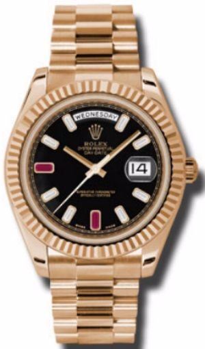 Model: 218235-BKDPR - CASE = [Material:18kt Rose Gold], [Case Diameter:41], [Bezel:Fluted 18kt Rose Gold], [Case Back:Solid], [Water Resistant:100 Meters - 330 Feet], [Crystal:Scratch Resistant Sapphire],; DIAL = [Color:Black set with diamonds and rubies, Baguette-cut diamond hour markers and baguette-cut rubies at 6 and 9 o'clock],; MOVEMENT = [Type:Automatic Self Winding], [Crown:Screw Down],; BAND = [Clasp:Deployment], [Type:18kt Rose Gold President], (Usually ships in 1 to 2 weeks.)