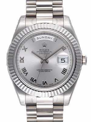 Model: 218239-SIRPR - CASE = [Material:18kt White Gold], [Case Diameter:41], [Bezel:Fluted], [Water Resistant:100 Meters - 330 Feet], [Crystal:Sapphire],; DIAL = [Color:Silver Roman Numeral],; MOVEMENT = [Type:Automatic Self Winding],; BAND = [Type:18k White Gold President], (Usually ships in 2 to 4 business days.)