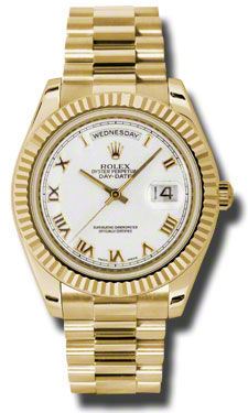 Model: 218238-WHRPR - CASE = [Material:18kt Yellow Gold], [Case Diameter:41], [Bezel:Fluted], [Water Resistant:100 Meters - 330 Feet], [Crystal:Scratch Resistant Sapphire], DIAL = [Color:White Roman Numeral], MOVEMENT = [Type:Automatic Self Winding], BAND = [Clasp:Deployant], [Type:18kt Yellow Gold], (Usually ships in 2 to 4 business days.)