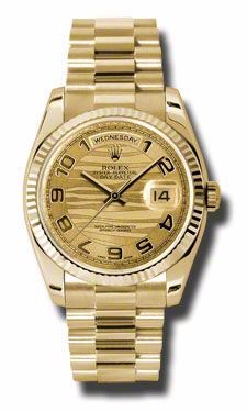 Model: 118238-CHAPR - CASE = [Material:18kt Yellow Gold], [Case Diameter:36], [Bezel:Fluted 18kt Yellow Gold], [Case Back:Solid], [Water Resistant:100 Meters - 330 Feet], [Crystal:Scratch Resistant Sapphire],; DIAL = [Color:Champagne Wave Arabic],; MOVEMENT = [Type:Automatic Self Winding], [Crown:Screw Down],; BAND = [Clasp:Concealed Crown], [Type:18kt Yellow Gold President], (Usually ships in 1 to 2 weeks.)