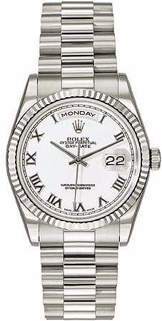 Model: 118239-WHRPR - CASE = [Material:18kt White Gold], [Case Diameter:36], [Bezel:18kt White Gold], [Water Resistant:100 Meters - 330 Feet], [Crystal:Scratch Resistant Sapphire],; DIAL = [Color:White Roman Numeral],; MOVEMENT = [Type:Automatic Self Winding],; BAND = [Clasp:Deployant], [Type:18kt White Gold President], (Usually ships in 1 to 2 weeks.)
