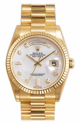 Model: 118238-MOPDPR - CASE = [Material:18kt Yellow Gold], [Case Diameter:36], [Bezel:Fluted], [Water Resistant:100 Meters - 330 Feet], [Crystal:Scratch Resistant Sapphire],; DIAL = [Color:Mother of Pearl Diamond],; MOVEMENT = [Type:Automatic Self Winding],; BAND = [Type:18kt Yellow Gold], (Usually ships in 1 to 2 weeks.)