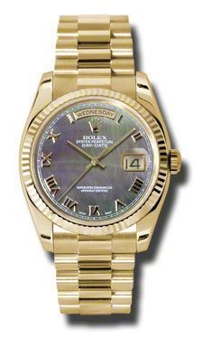 Model: 118238-BKMOPRPR - CASE = [Material:18kt Yellow Gold], [Case Diameter:36], [Bezel:Fluted 18kt Yellow Gold], [Case Back:Solid], [Water Resistant:100 Meters - 330 Feet], [Crystal:Scratch Resistant Sapphire],; DIAL = [Color:Black Mother of Pearl Roman Numeral],; MOVEMENT = [Type:Automatic Self Winding], [Crown:Screw Down],; BAND = [Clasp:Concealed Crown], [Type:18kt Yellow Gold President], (Usually ships in 1 to 2 weeks.)