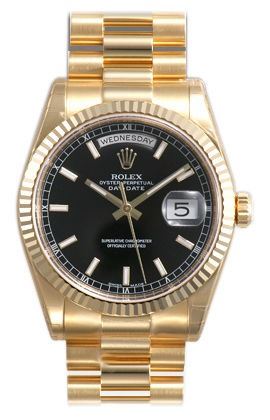 Model: 118238-BKSPR - CASE = [Material:18kt Yellow Gold], [Case Diameter:36], [Bezel:Fluted], [Water Resistant:100 Meters - 330 Feet], [Crystal:Scratch Resistant Sapphire],; DIAL = [Color:Black Stick],; MOVEMENT = [Type:Automatic Self Winding],; BAND = [Type:18kt Yellow Gold President], (Usually ships in 1 to 2 weeks.)