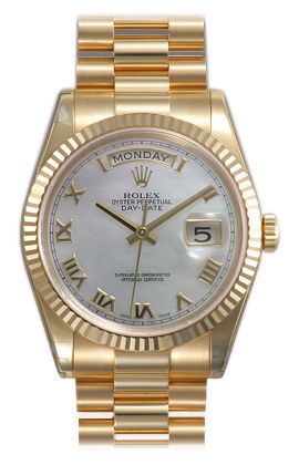 Model: 118238-MOPRPR - Case,; MATERIAL18KT YELLOW GOLD = [Case Diameter36], [BezelFluted], [Water Resistant100 Meters - 330 Feet], [CrystalScratch Resistant Sapphire], Dial,; COLORMOTHER OF PEARL ROMAN NUMERAL = Movement,; TYPEAUTOMATIC SELF WINDING = Band,; TYPE18KT YELLOW GOLD = (Usually ships in 1 to 2 weeks.)