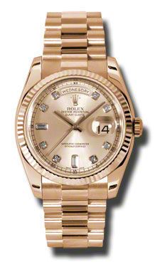 Model: 118235-CHDPR - CASE = [Material:18kt Rose Gold], [Case Diameter:36], [Bezel:Fluted 18kt Rose Gold], [Case Back:Solid], [Water Resistant:100 Meters - 330 Feet], [Crystal:Sapphire], DIAL = [Color:Champagne Diamond], MOVEMENT = [Type:Automatic Self Winding], [Crown:Screw Down], BAND = [Clasp:Concealed Crown], [Type:18kt Rose Gold President], (Usually ships in 1 to 2 weeks.)