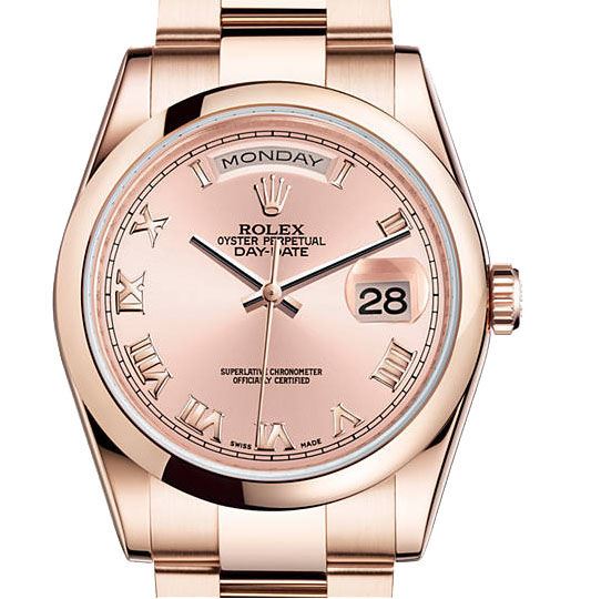 Model: 118205-PIRO - CASE = [Material:18kt Rose Gold], [Case Diameter:36], [Water Resistant:100 Meters - 330 Feet], [Crystal:Scratch Resistant Sapphire], DIAL = [Color:Pink with Rose Gold Hands and Roman Numerals], MOVEMENT = [Type:Automatic Self Winding], [Crown:Screw Down], BAND = [Clasp:Folding], [Type:18kt Rose Gold], (Usually ships in 1 to 2 weeks.)