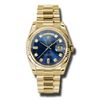 Model: 118238-BLDPR - CASE = [Material:18kt Yellow Gold], [Case Diameter:36], [Bezel:Fluted 18kt Yellow Gold], [Case Back:Solid], [Water Resistant:100 Meters - 330 Feet], [Crystal:Scratch Resistant Sapphire], DIAL = [Color:Blue Diamond], MOVEMENT = [Type:Automatic Self Winding], [Crown:Screw Down], BAND = [Clasp:Concealed Crown], [Type:18kt Yellow Gold President], (Usually ships in 1 to 2 weeks.)