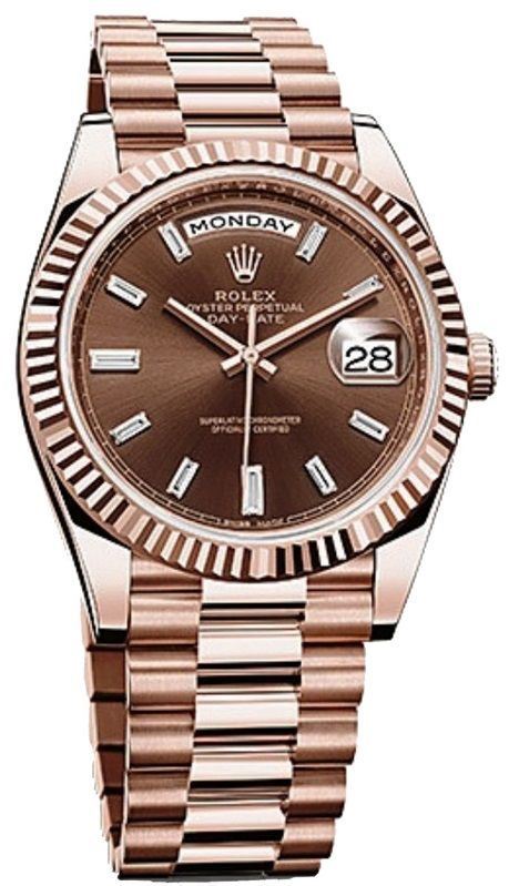 Model: 228235-BRDPR - CASE = [Material:18kt Rose Gold], [Case Diameter:40], [Water Resistant:100 Meters - 330 Feet], [Crystal:Scratch Resistant Sapphire], DIAL = [Color:Brown with Rose Gold Hands and Baguette Diamond Hour Markers], MOVEMENT = [Type:Automatic Self Winding], [Crown:Screw Down], BAND = [Clasp:Folding], [Type:18kt Rose Gold], (Usually ships in 1 to 2 weeks.)