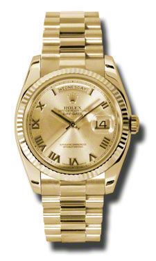 Model: 118238-CHRPR - CASE = [Material:18kt Yellow Gold], [Case Diameter:36], [Bezel:Fluted 18kt Yellow Gold], [Case Back:Solid], [Water Resistant:100 Meters - 330 Feet], [Crystal:Scratch Resistant Sapphire], DIAL = [Color:Champagne Roman Numeral], MOVEMENT = [Type:Automatic Self Winding], [Crown:Screw Down], BAND = [Clasp:Concealed Crown], [Type:18kt Yellow Gold President], (Usually ships in 1 to 2 weeks.)