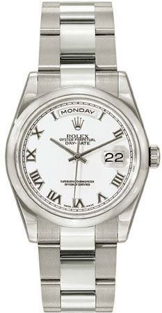 Model: 118209-WHRO - CASE = [Material:18kt White Gold], [Case Diameter:36], [Bezel:Fixed Domed], [Water Resistant:100 Meters - 330 Feet], [Crystal:Scratch Resistant Sapphire], DIAL = [Color:White Roman Numeral], MOVEMENT = [Type:Automatic Self Winding], BAND = [Type:18kt Yellow Gold Oyster], (Usually ships in 1 to 2 weeks.)