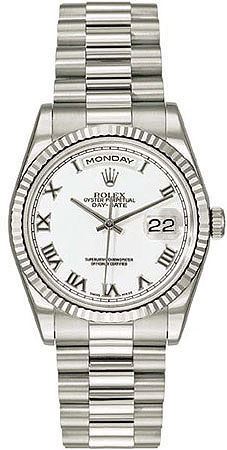 Model: 118239-WHRPR - CASE = [Material:18kt White Gold], [Case Diameter:36], [Bezel:18kt White Gold], [Water Resistant:100 Meters - 330 Feet], [Crystal:Scratch Resistant Sapphire], DIAL = [Color:White Roman Numeral], MOVEMENT = [Type:Automatic Self Winding], BAND = [Clasp:Deployant], [Type:18kt White Gold President], (Usually ships in 1 to 2 weeks.)