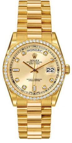 Model: 118348-CHDPR - CASE = [Material:18kt Yellow Gold], [Case Diameter:36], [Bezel:Yellow Gold Fixed, Diamond], [Crystal:Synthetic Sapphire], DIAL = [Color:Champagne Diamond], MOVEMENT = [Type:Automatic Self Winding], BAND = [Clasp:Deployant], [Type:18kt Yellow Gold], (Usually ships in 1 to 2 weeks.)