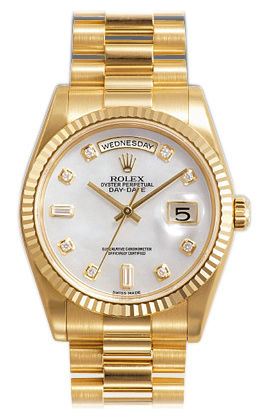 Model: 118238-MOPDPR - CASE = [Material:18kt Yellow Gold], [Case Diameter:36], [Bezel:Fluted], [Water Resistant:100 Meters - 330 Feet], [Crystal:Scratch Resistant Sapphire], DIAL = [Color:Mother of Pearl Diamond], MOVEMENT = [Type:Automatic Self Winding], BAND = [Type:18kt Yellow Gold], (Usually ships in 1 to 2 weeks.)
