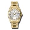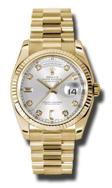 Model: 118238-SIDPR - CASE = [Material:18kt Yellow Gold], [Case Diameter:36], [Bezel:Fluted 18kt Yellow Gold], [Case Back:Solid], [Water Resistant:100 Meters - 330 Feet], [Crystal:Scratch Resistant Sapphire], DIAL = [Color:Silver Diamond], MOVEMENT = [Type:Automatic Self Winding], [Crown:Screw Down], BAND = [Clasp:Concealed Crown], [Type:18kt Yellow Gold President], (Usually ships in 1 to 2 weeks.)