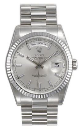 Model: 118239-SISPR - CASE = [Material:18kt White Gold], [Case Diameter:36], [Bezel:Fluted], [Water Resistant:100 Meters - 330 Feet], [Crystal:Scratch Resistant Sapphire], DIAL = [Color:Silver Stick], MOVEMENT = [Type:Automatic Self Winding], BAND = [Type:18kt White Gold President], (Usually ships in 1 to 2 weeks.)