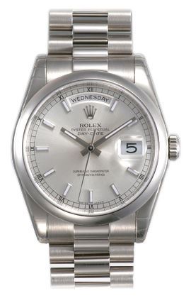 Model: 118209-SISO - CASE = [Material:18kt White Gold], [Case Diameter:36], [Bezel:Fixed Domed], [Water Resistant:100 Meters - 330 Feet], [Crystal:Scratch Resistant Sapphire], DIAL = [Color:Silver Stick], MOVEMENT = [Type:Automatic Self Winding], BAND = [Clasp:Deployant], [Type:18kt Yellow Gold Oyster], (Usually ships in 1 to 2 weeks.)