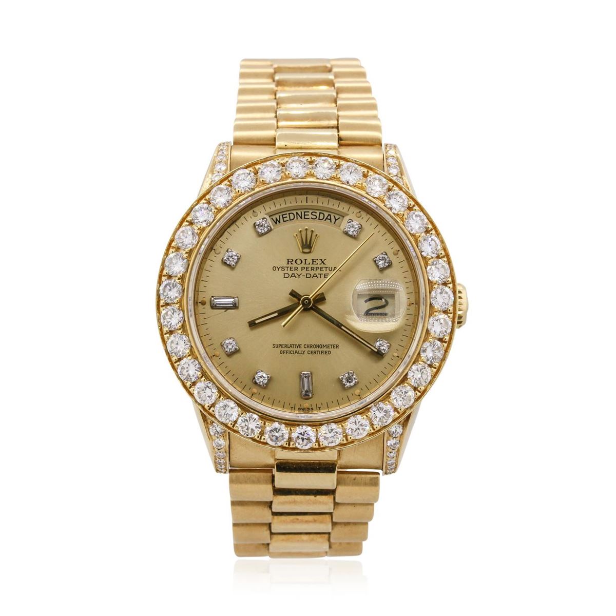 One gents, hand crafted & machine milled Rolex DayDate Model wristwatch electronically tested 18KT yellow gold, Case: 36mm oyster, Crown: twin lock with logo, Custom Bezel: diamond set, Custom Crystal: synthetic sapphire cyclops lens, Circa 1978. Movement: superlative chronometer, Dial: Champagne color, with baton hands, & diamond markers, Calendar: single quick set, Bracelet: 18KT yellow gold, bright polish & brushed finish, Condition: G-4 Average. Seven and one half inch length. Concealed deployment clasp, with logo Containing: Fifty Nine prong & bead set round brilliant cut diamonds, approximate total weight equals 3.70ct. Set & graded in the bezel, and the case lugs. Clarity: SI-1 to I-1. Color: G - I. Total Weight of Diamonds 3.70ct. Total Weight of Watch 143.62 grams. AIG Appraised at $28,990.00.