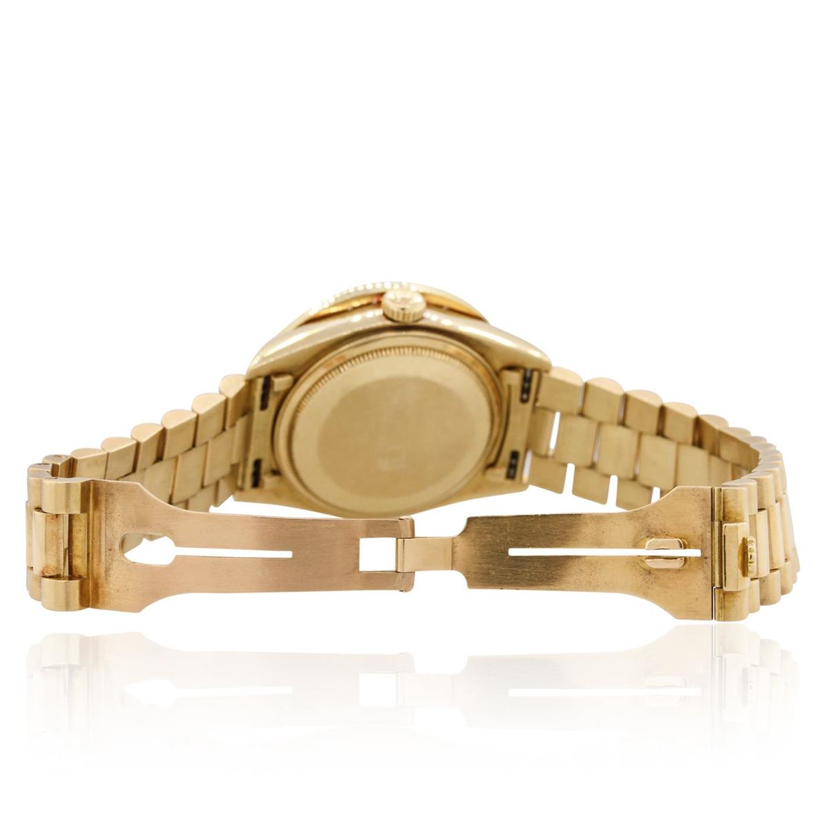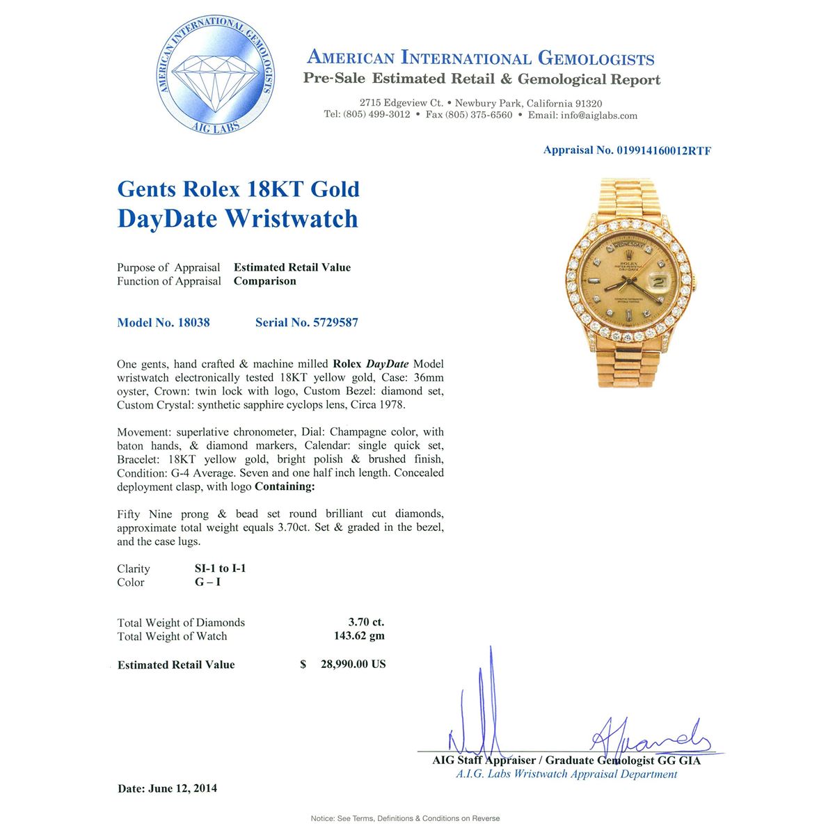 One gents, hand crafted & machine milled Rolex DayDate Model wristwatch electronically tested 18KT yellow gold, Case: 36mm oyster, Crown: twin lock with logo, Custom Bezel: diamond set, Custom Crystal: synthetic sapphire cyclops lens, Circa 1978. Movement: superlative chronometer, Dial: Champagne color, with baton hands, & diamond markers, Calendar: single quick set, Bracelet: 18KT yellow gold, bright polish & brushed finish, Condition: G-4 Average. Seven and one half inch length. Concealed deployment clasp, with logo Containing: Fifty Nine prong & bead set round brilliant cut diamonds, approximate total weight equals 3.70ct. Set & graded in the bezel, and the case lugs. Clarity: SI-1 to I-1. Color: G - I. Total Weight of Diamonds 3.70ct. Total Weight of Watch 143.62 grams. AIG Appraised at $28,990.00.