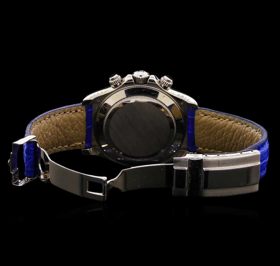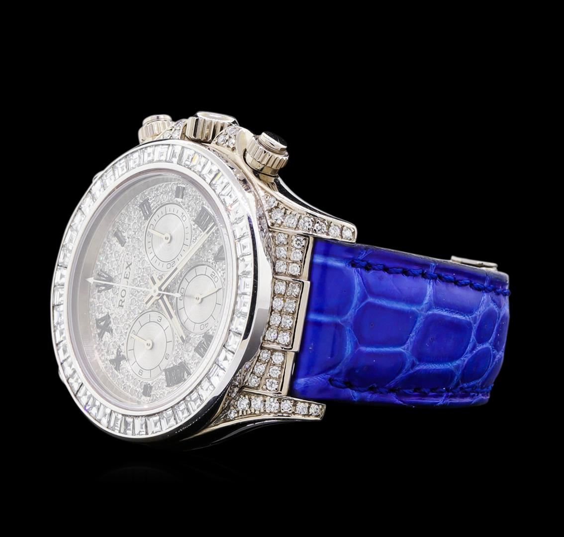One Rolex Daytona watch featuring: Case: round, 47mm x 43mm 18KT white gold, set with diamonds. Dial: Diamond encrusted white gold with Roman numerals. Bezel: 18KT white gold with diamonds. Movement: Automatic. Crystal: Sapphire. Bracelet: Blue leather with 18KT white gold deployment buckle. Condition: minor scratches on case and minor wear on bracelet, but otherwise in excellent condition.