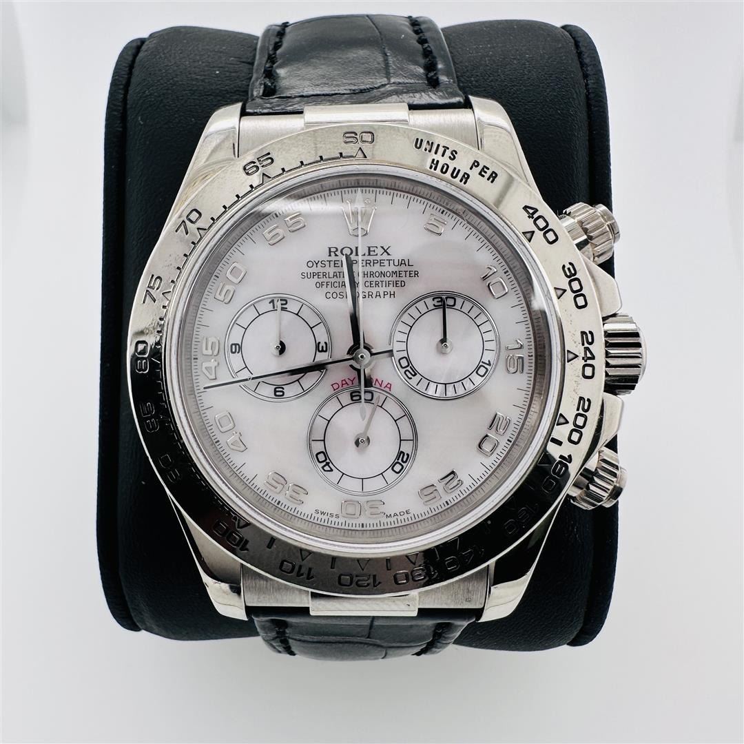 One Rolex Daytona 18k White Gold MoP Dial with Leather Strap Wristwatch (Very Rare). This watch is in excellent condition. The watch photographed is the actual watch.