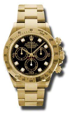 Model: 116528-BKDO - CASE = [Material:18kt Yellow Gold], [Case Diameter:40], [Bezel:Engraved Bezel], [Water Resistant:100 Meters - 330 Feet], [Crystal:Sapphire], DIAL = [Color:Black Diamond], MOVEMENT = [Type:Automatic Self Winding Chronograph], [Crown:Screw Down], BAND = [Clasp:Deployant Clasp], [Type:18k Yellow Gold Oyster], (Usually ships in 1 to 2 weeks.)