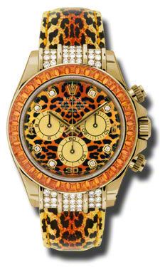 Model: 116598-LPDLPL - CASE = [Material:18kt Yellow Gold], [Case Diameter:40], [Case Thickness:11.2mm], [Bezel:18kt Yellow Gold set with 36 Cognac Baguette Sapph], [Case Back:Solid], [Water Resistant:100 Meters - 330 Feet], [Crystal:Scratch Resistant Sapphire], DIAL = [Color:Leopard Print Diamond], MOVEMENT = [Type:Automatic Self Winding Chronograph], [Crown:Screw Down], BAND = [Clasp:Safety], [Type:Leopard Print Leather], (Usually ships in 1 to 2 weeks.)