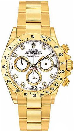 Model: 116528-WHDO - CASE = [Material:18kt Yellow Gold], [Case Diameter:40], [Bezel:Engraved Bezel], [Water Resistant:100 Meters - 330 Feet], [Crystal:Sapphire], DIAL = [Color:White Diamond], MOVEMENT = [Type:Automatic Self Winding Chronograph], [Crown:Screw Down], BAND = [Clasp:Deployant Clasp], [Type:18k Yellow Gold], (Usually ships in 1 to 2 weeks.)