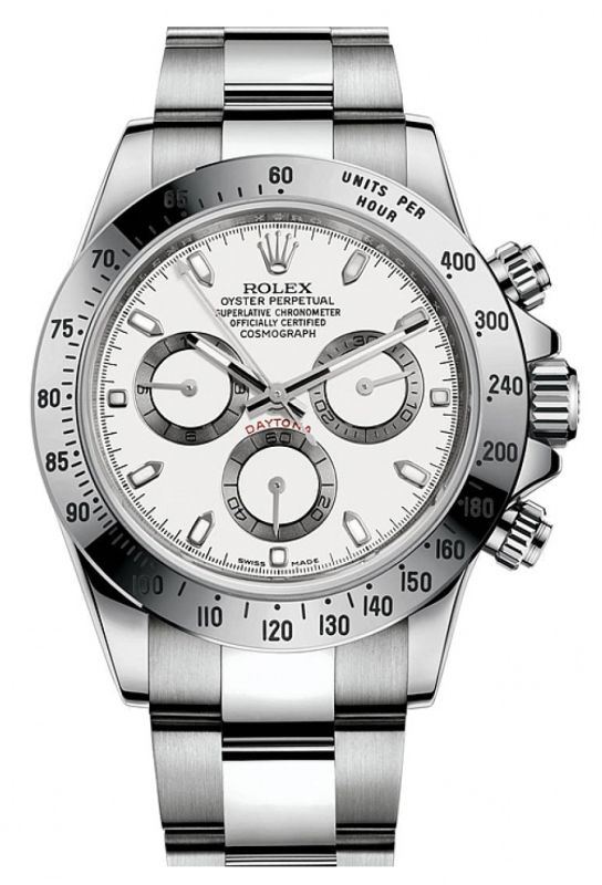 Model: 116520-WHSO - CASE = [Material:Stainless Steel], [Case Diameter:40], [Bezel:Fixed Stainless Steel with engraved Tachymeter], [Case Back:Solid], [Water Resistant:100 Meters - 330 Feet], [Crystal:Scratch Resistant Sapphire], DIAL = [Color:White Stick], MOVEMENT = [Type:Automatic Self Winding Chronograph], [Crown:Screw Down], BAND = [Clasp:Deployant Clasp], [Type:Stainless Steel], (Usually ships in 2 to 4 business days.)