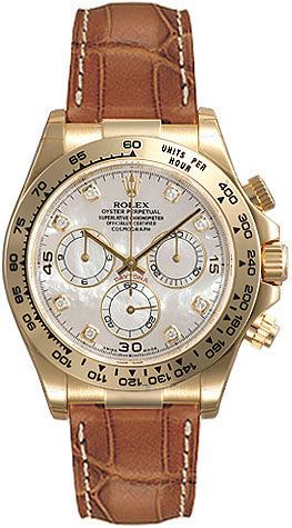 Model: 116518-WHMOPDBRL - CASE = [Material:18kt Yellow Gold], [Case Diameter:40], [Bezel:Fixed Engraved], [Water Resistant:100 Meters - 330 Feet], [Crystal:Scratch Resistant Sapphire], DIAL = [Color:White Mother of Pearl Diamond], MOVEMENT = [Type:44 Jewels Automatic Self Winding], [Crown:Screw Down], BAND = [Clasp:Fold-through Buckle Deployant], [Type:Brown Leather], (Usually ships in 1 to 2 weeks.)