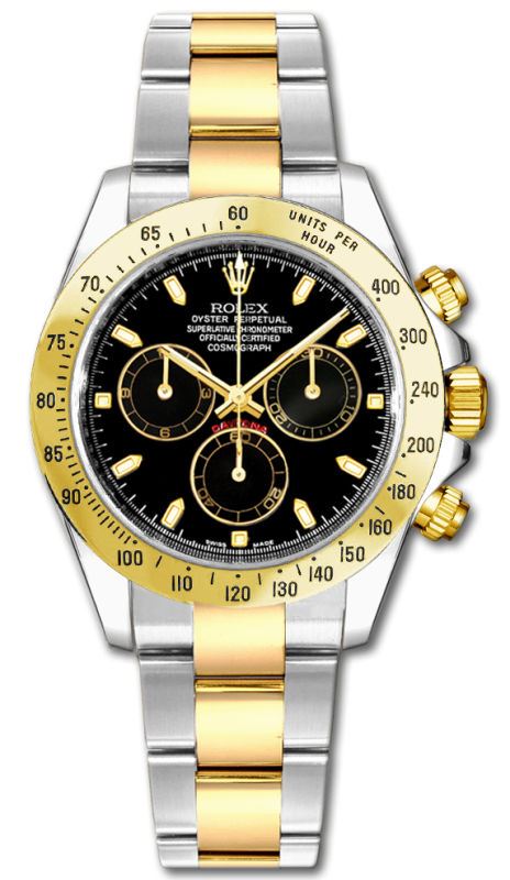 Model: 116523-BLKSO - CASE = [Material:18kt Yellow Gold And Stainless Steel], [Case Diameter:40], [Bezel:Fixed Engraved], [Water Resistant:100 Meters - 330 Feet], [Crystal:Scratch Resistant Sapphire], DIAL = [Color:Black Stick], MOVEMENT = [Type:Automatic Self Winding Chronograph], [Crown:Screw Down], BAND = [Clasp:Deployant Clasp], [Type:18kt Yellow Gold And Stainless Steel], (Usually ships in 1 to 2 weeks.)
