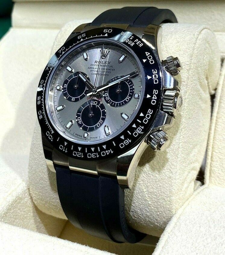 Description: Rolex Daytona 18K White Gold 116519LN OysterFlex Cosmograph.