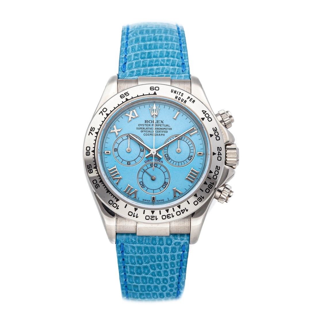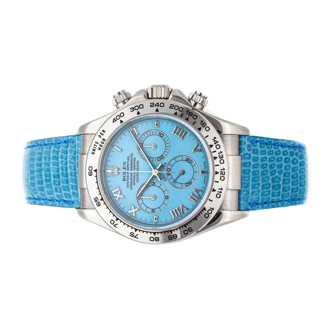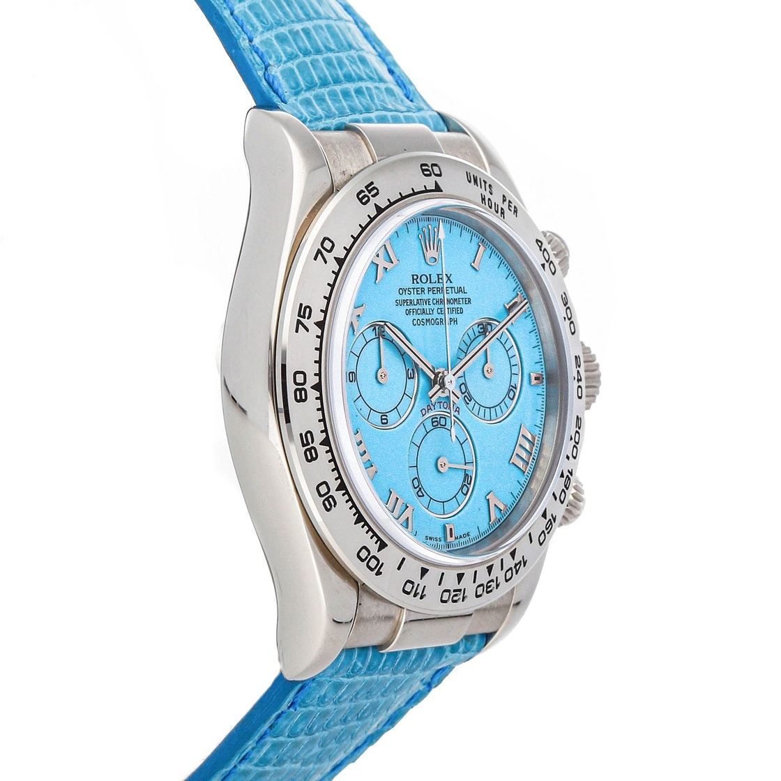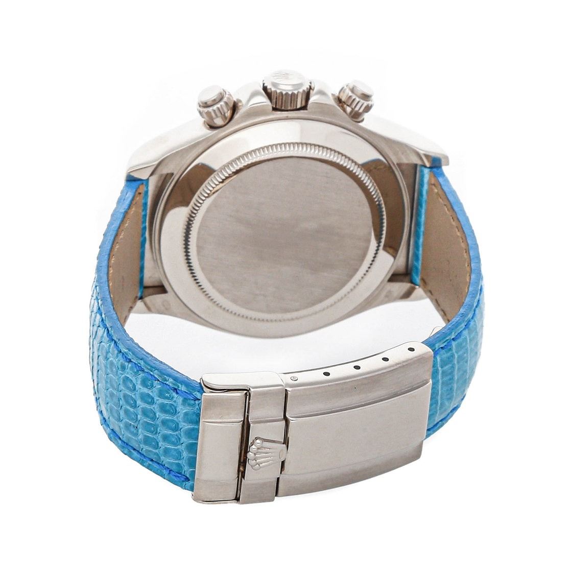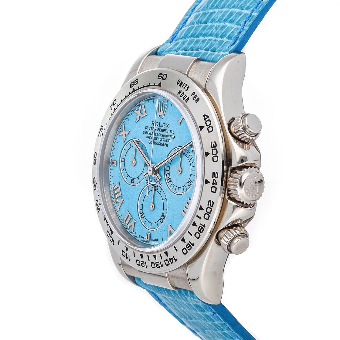 Rolex Daytona (116519) self-winding automatic watch, features a 40mm 18k white gold case surrounding a turquoise dial on a turquoise lizard strap with an 18k white gold deployant buckle. Functions include hours, minutes, small seconds and chronograph. This watch has been serviced.