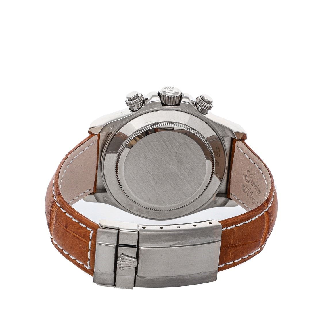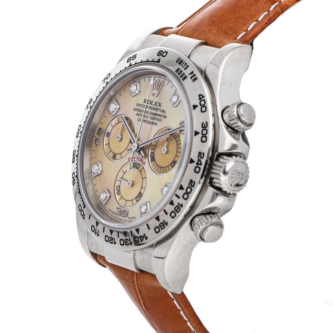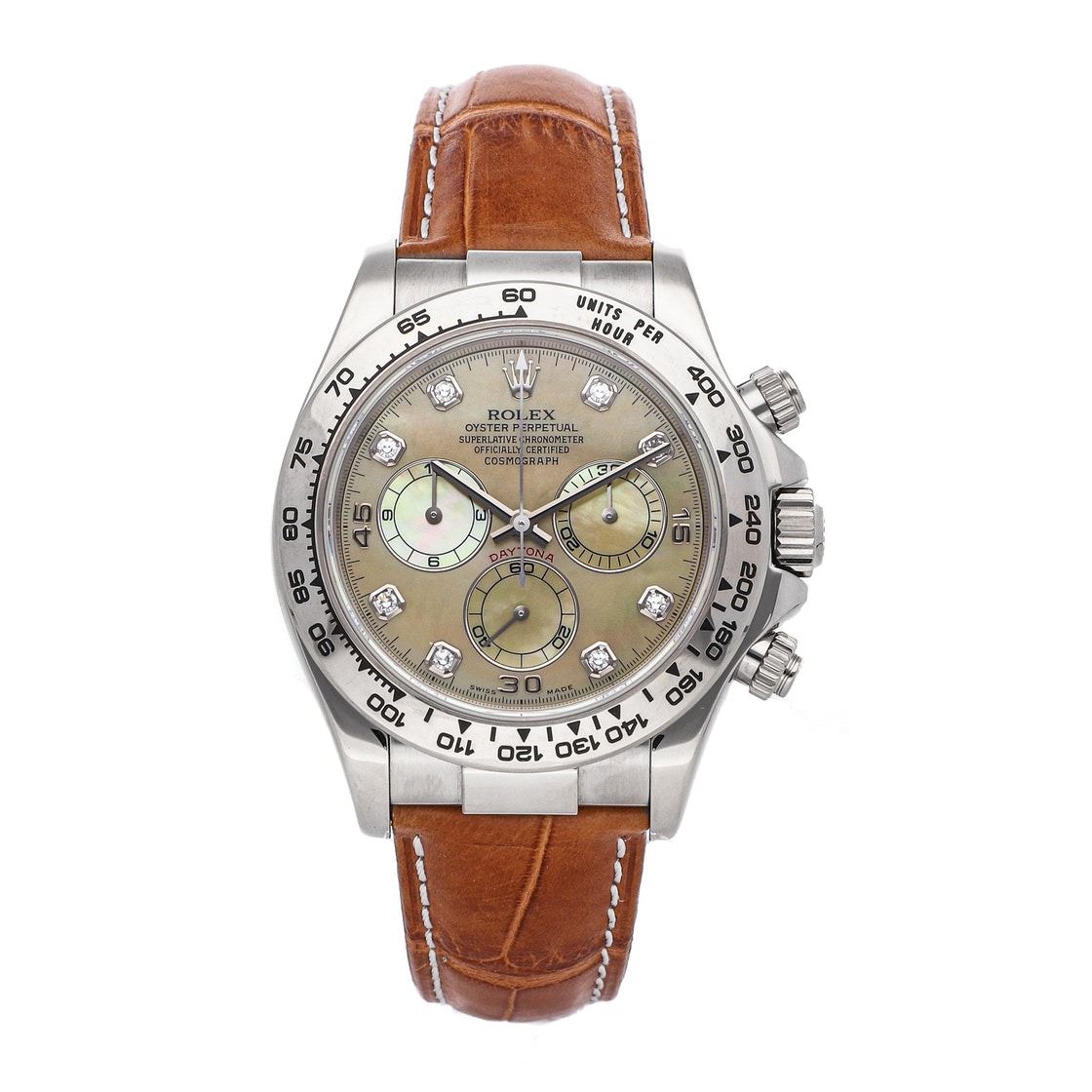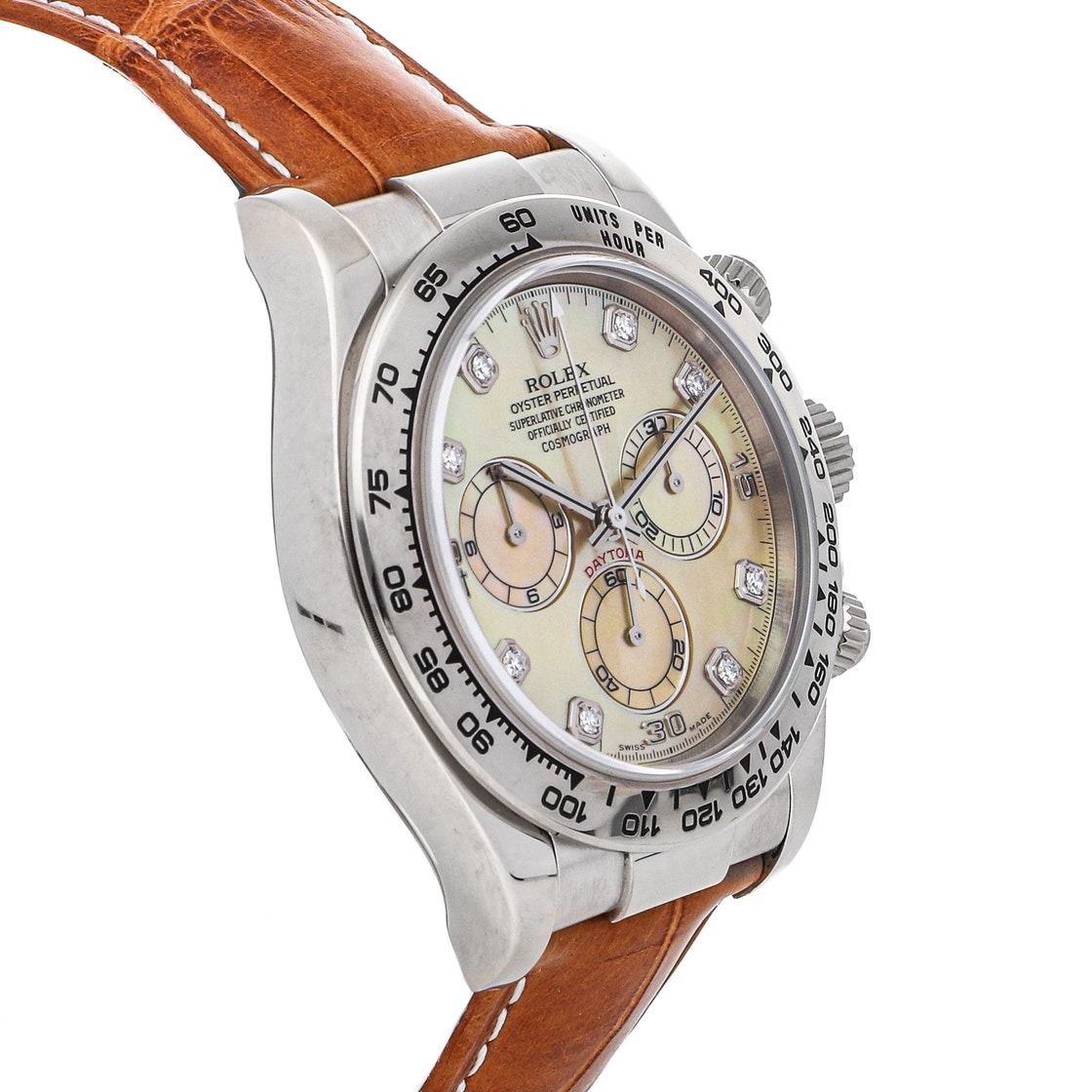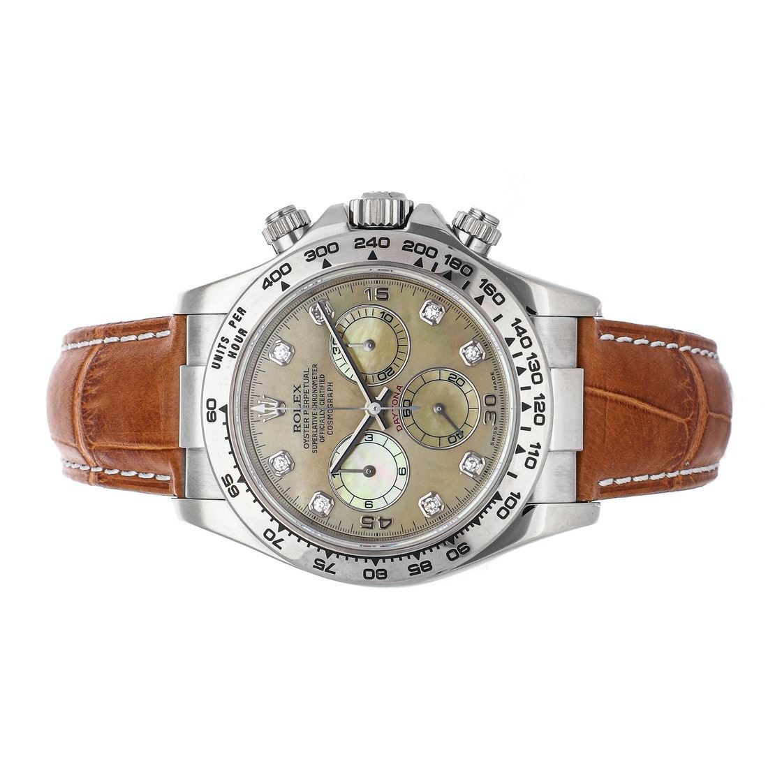 Pre-Owned Rolex Daytona (116519) self-winding automatic watch, features a 40mm 18k white gold case surrounding a gold mother-of-pearl diamond dial on a brown alligator strap with an 18k white gold deployant buckle.
