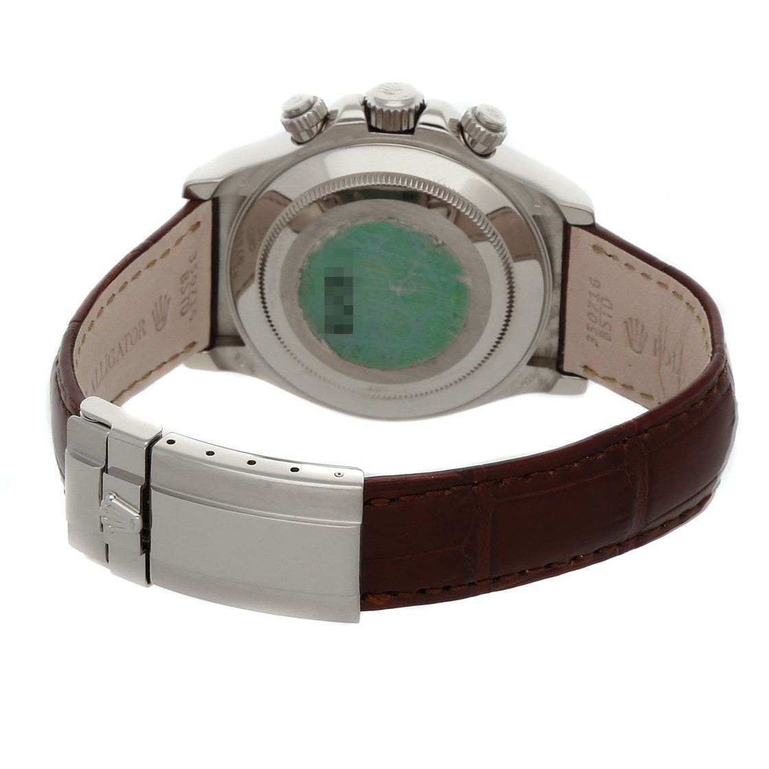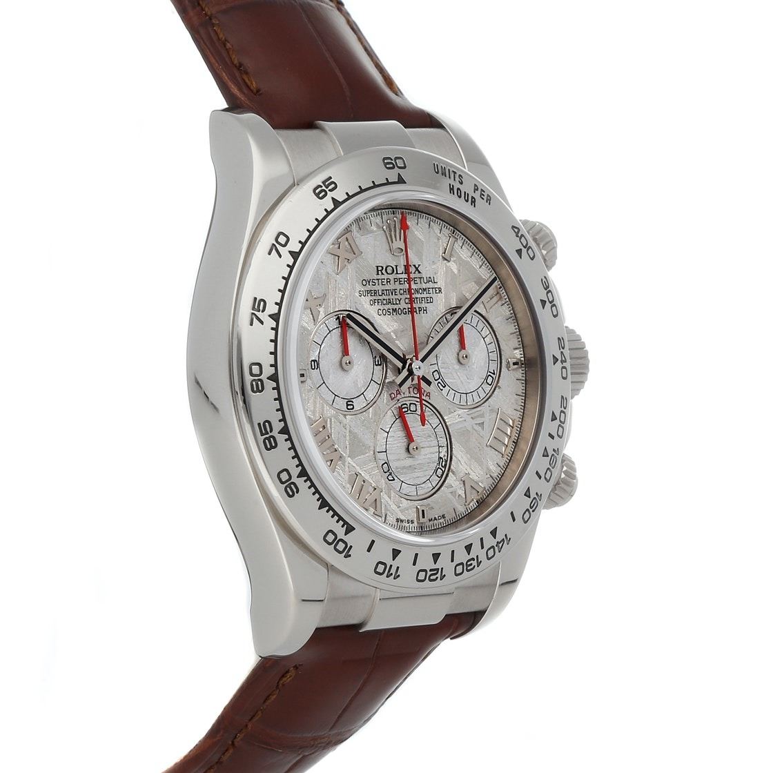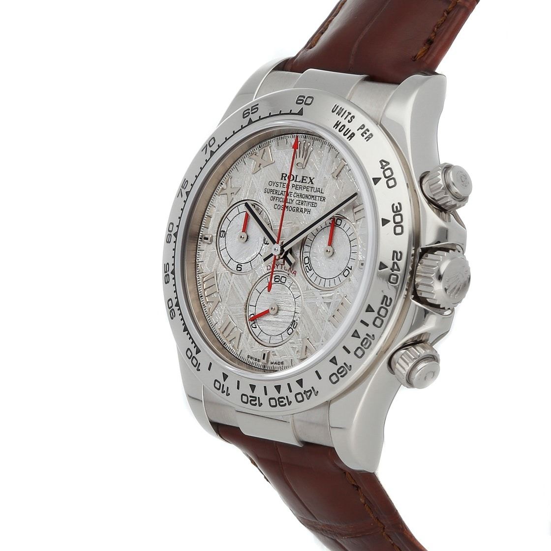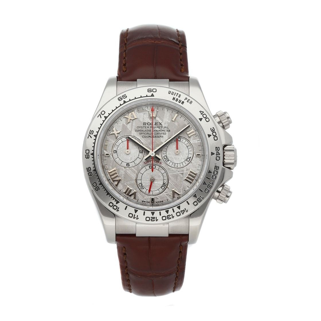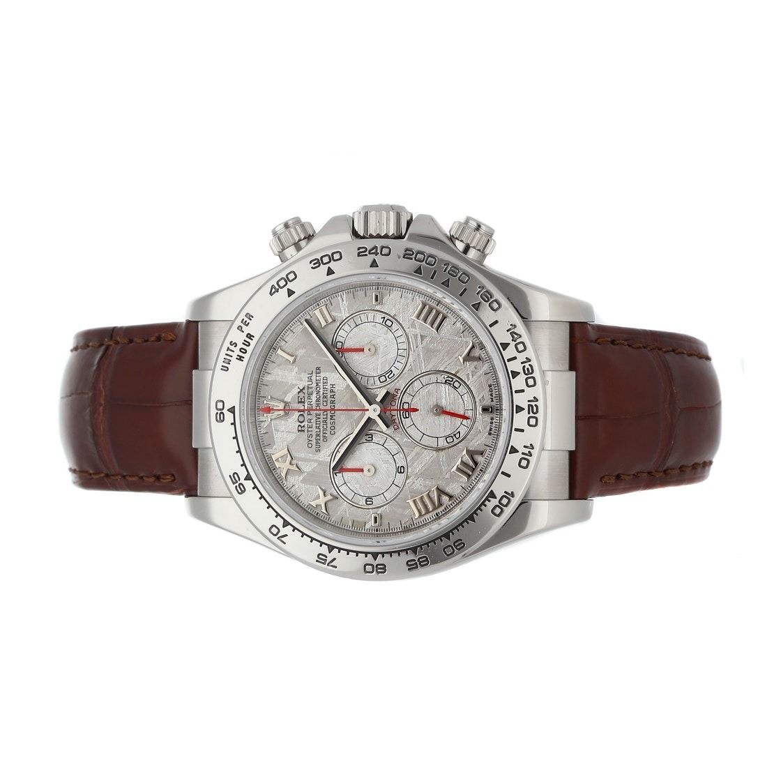 Pre-Owned Rolex Daytona (116519) self-winding automatic watch, features a 40mm 18k white gold case surrounding a meteorite dial on a brown alligator strap with an 18k white gold deployant buckle. Functions include hours, minutes, small seconds and chronograph.